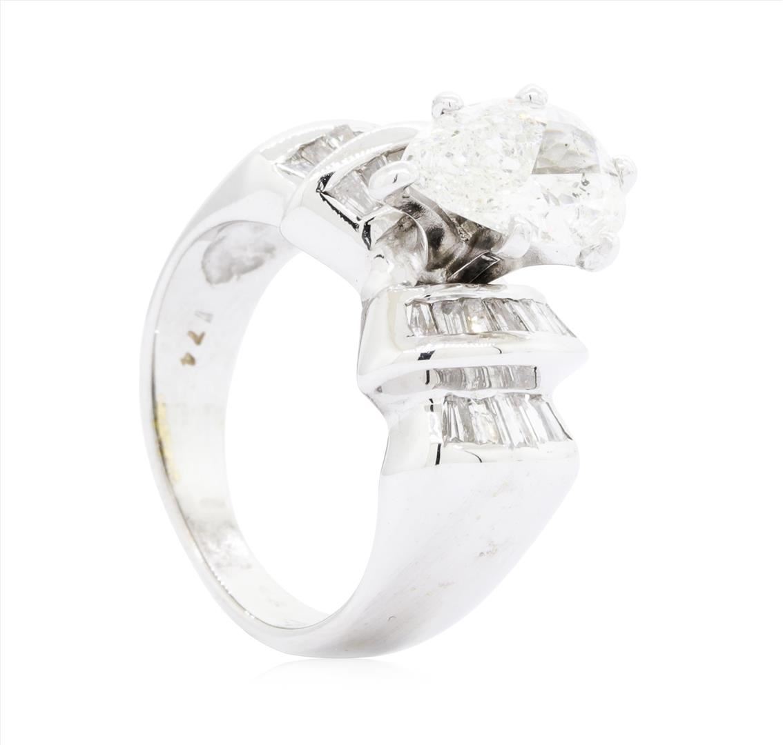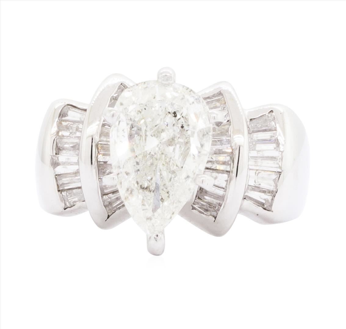 One electronically tested 14KT white gold lady's cast fashion ring with a tapered shank with a bright polish finish. The featured lady's ring has a bow motif and a shank measuring 3.30 millimeters wide. Identified with markings of '14K'. Condition is like new, good workmanship. Containing: One prong set pear shaped cut diamond, measuring 10.90 x 7.20 x 4.20mm (depth est.) approximate weight of 2.02ct. Graded in the setting. Color I Clarity I-1 Cut Good Twenty-Seven channel set baguette cut diamonds, measuring from 2.30 x 1.40 x 1.19mm (depth est.) to 2.40 x 1.60 x 1.36mm (depth est.) approximate total weight of 27 Stones = 1.05ct. Graded in the setting. Color H - I Clarity I-1 to I-2 Cut Good. Total Weight of Diamonds 3.07ct.. Total Weight of Ring 8.10gm GAS Appraised.