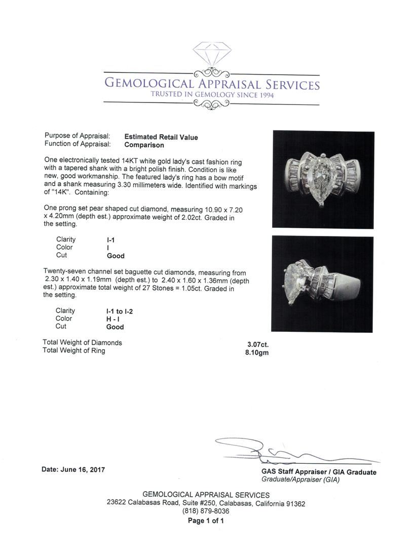 One electronically tested 14KT white gold lady's cast fashion ring with a tapered shank with a bright polish finish. The featured lady's ring has a bow motif and a shank measuring 3.30 millimeters wide. Identified with markings of '14K'. Condition is like new, good workmanship. Containing: One prong set pear shaped cut diamond, measuring 10.90 x 7.20 x 4.20mm (depth est.) approximate weight of 2.02ct. Graded in the setting. Color I Clarity I-1 Cut Good Twenty-Seven channel set baguette cut diamonds, measuring from 2.30 x 1.40 x 1.19mm (depth est.) to 2.40 x 1.60 x 1.36mm (depth est.) approximate total weight of 27 Stones = 1.05ct. Graded in the setting. Color H - I Clarity I-1 to I-2 Cut Good. Total Weight of Diamonds 3.07ct.. Total Weight of Ring 8.10gm GAS Appraised.