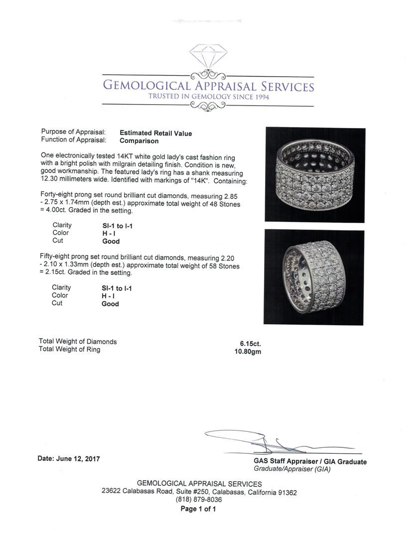 One electronically tested 14KT white gold lady's cast fashion ring with a bright polish with milgrain detailing finish. The featured lady's ring has a shank measuring 12.30 millimeters wide. Identified with markings of '14K'. Condition is new, good workmanship. Containing: Forty-Eight prong set round brilliant cut diamonds, measuring 2.85 - 2.75 x 1.74mm (depth est.) approximate total weight of 48 Stones = 4.00ct. Graded in the setting. Color H - I Clarity SI-1 to I-1 Cut Good Fifty-Eight prong set round brilliant cut diamonds, measuring 2.20 - 2.10 x 1.33mm (depth est.) approximate total weight of 58 Stones = 2.15ct. Graded in the setting. Color H - I Clarity SI-1 to I-1 Cut Good. Total Weight of Diamonds 6.15ct.. Total Weight of Ring 10.80gm GAS Appraised.