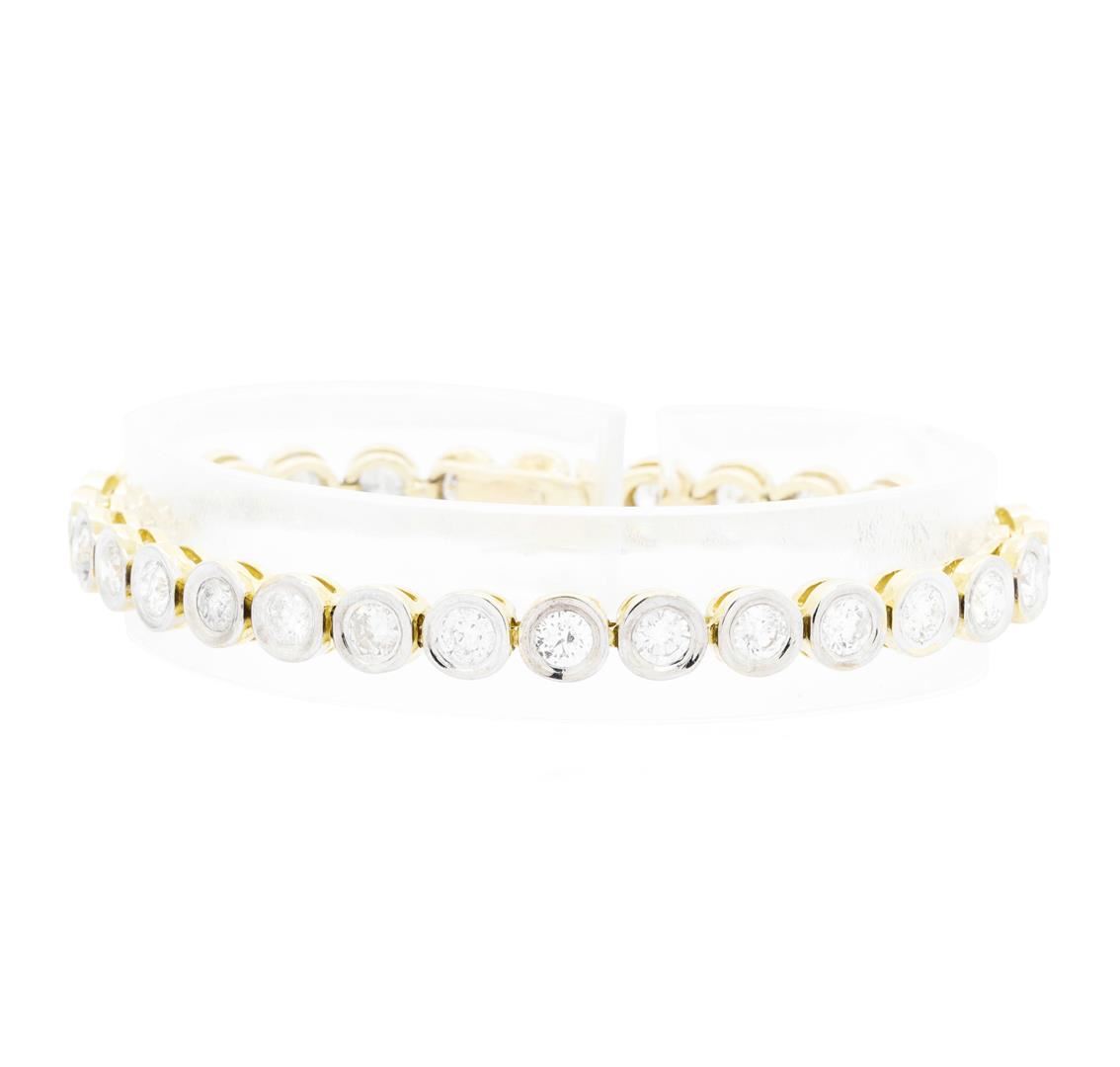 One electronically tested 14KT yellow with rhodium plating gold lady's combination cast & assembled fashion tennis bracelet with a tongue clasp with foldover safety with a bright polish finish. The featured lady's tennis bracelet measures approximately seven inches in length. Condition is like new, good workmanship. Containing: Twenty-Nine bezel set round brilliant cut diamonds, measuring 4.15 - 4.05 x 2.46mm (depth est.) approximate total weight of 29 Stones = 7.25ct. Graded in the setting. Color G - I Clarity I-1 to I-2 Cut Good. Total Weight of Diamonds 7.25ct.. Total Weight of Bracelet 22.00gm GAS Appraised.