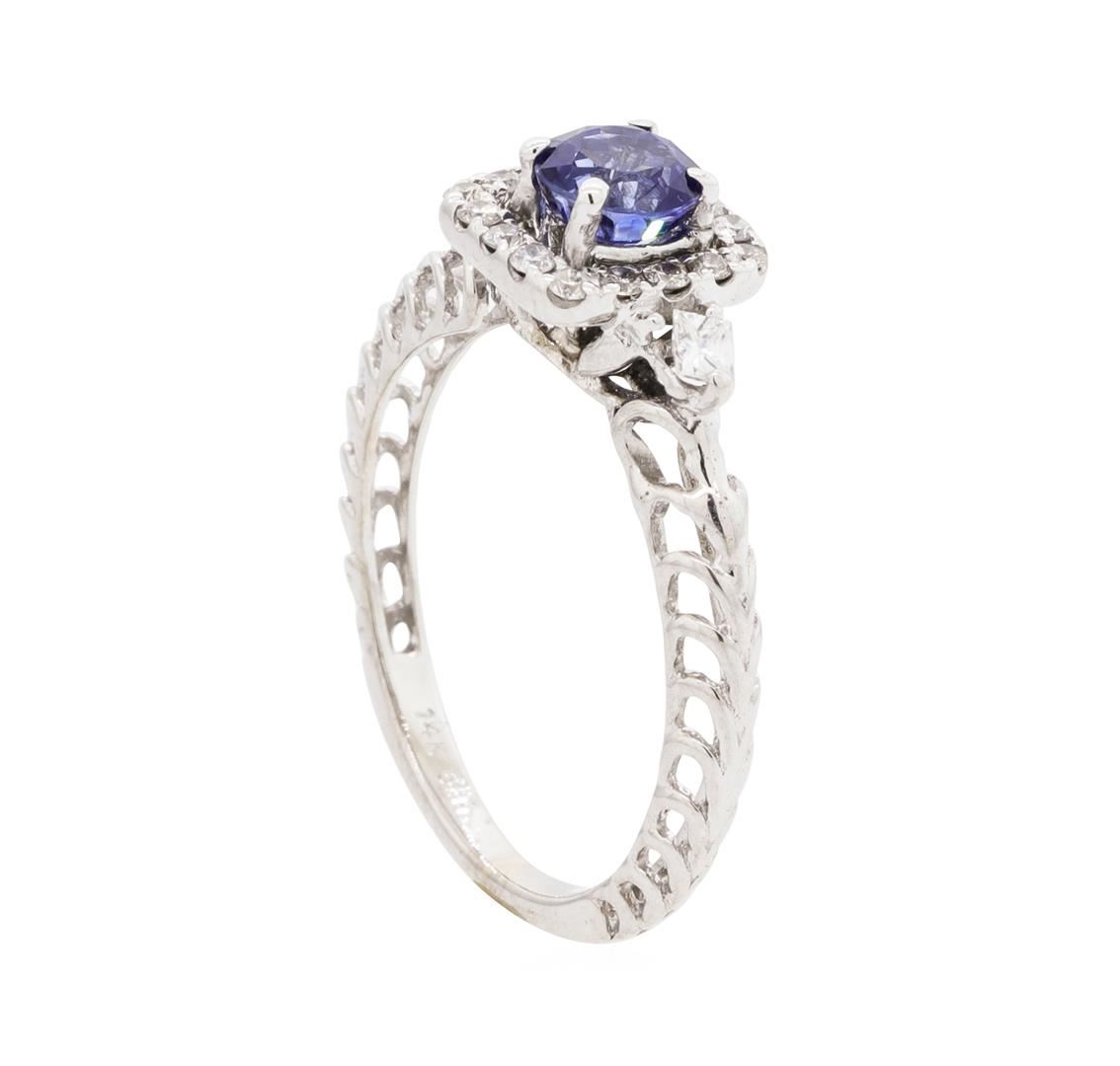 One lady's ring featuring: 14KT white gold weighing 2.3 grams containing one sapphire weighing 0.64ct and diamonds weighing 0.15ctw. The ring is a size 6.