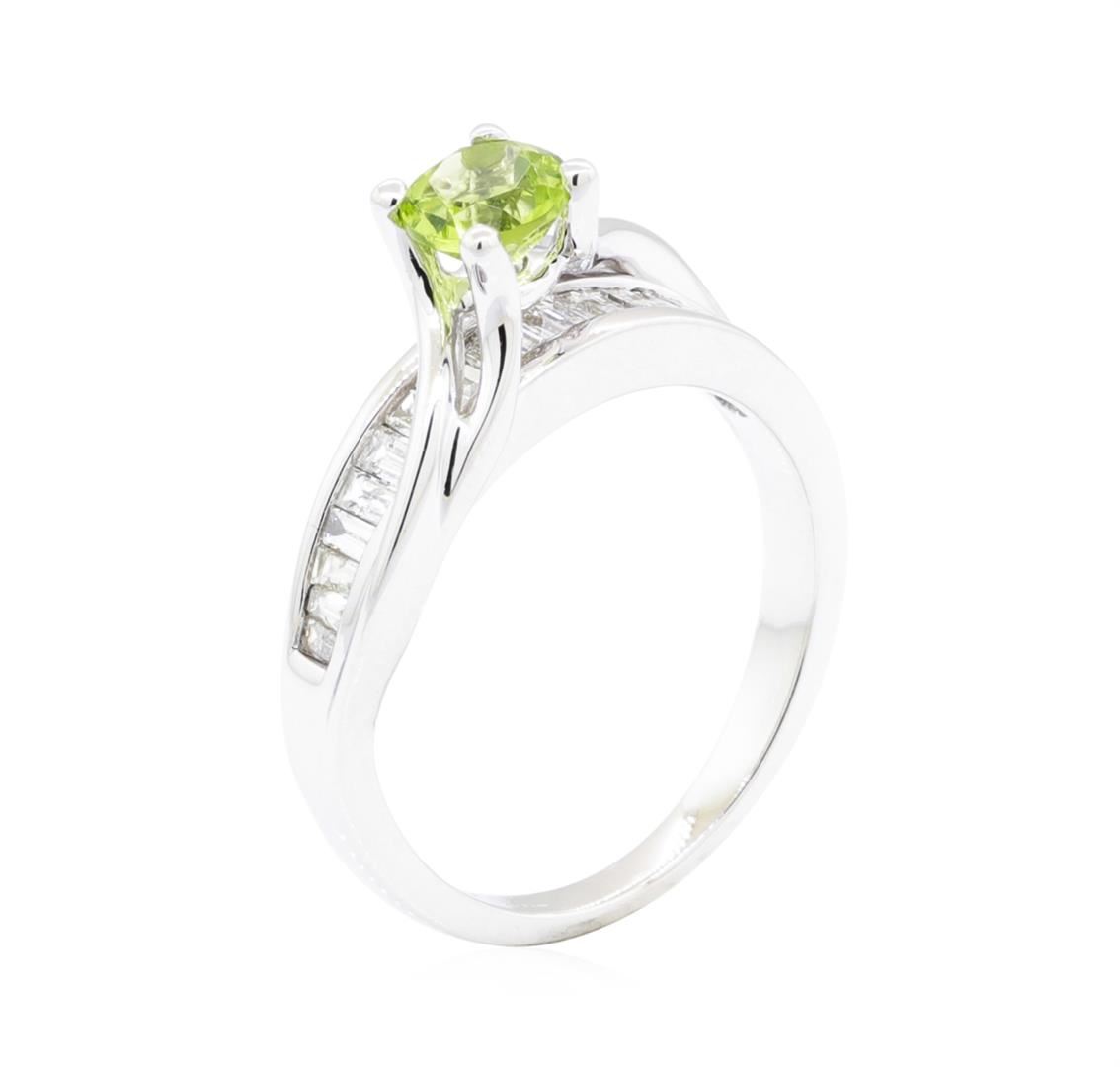 One ring featuring: 14KT white gold weighing 4.4 grams containing one peridot weighing 0.70ct and diamonds weighing 0.50ctw. The ring is a size 6.