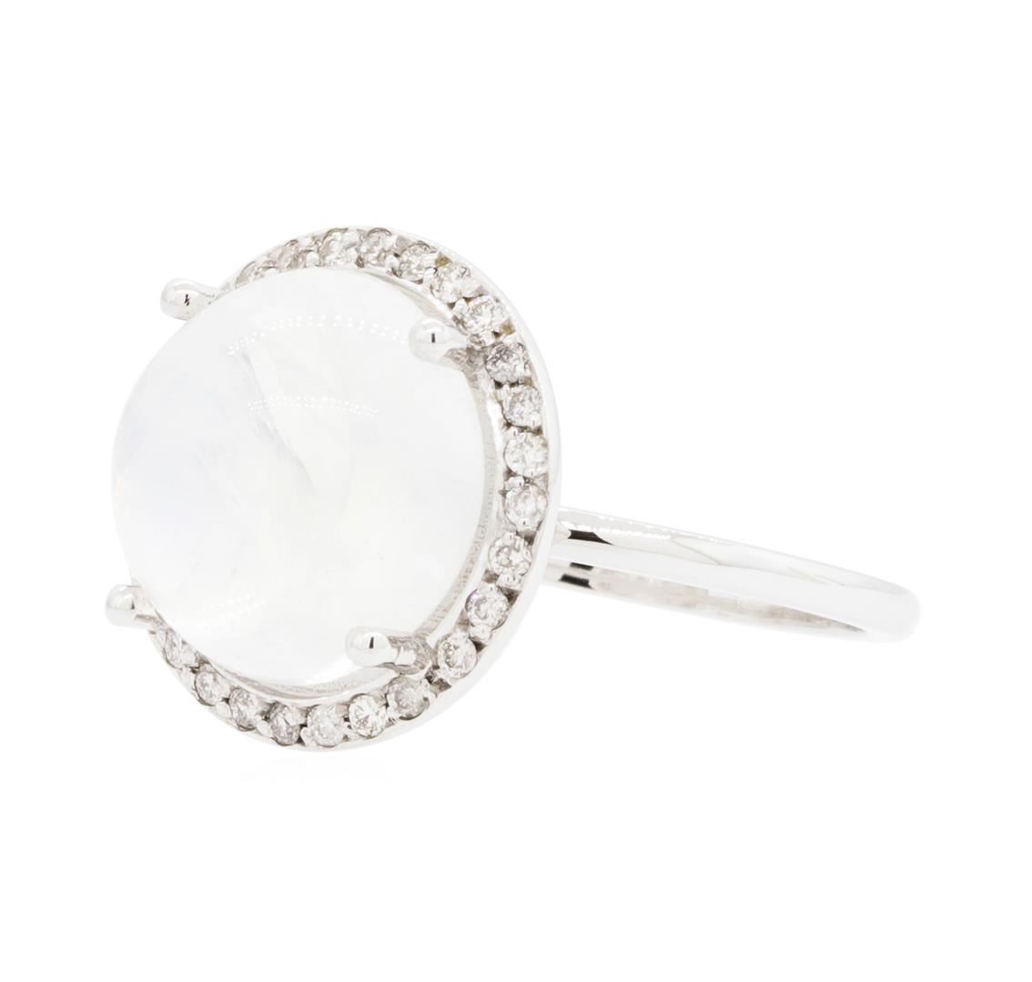 One lady's ring featuring: 14KT white gold weighing 4.9 grams containing one moonstone weighing 6.93ct and diamonds weighing 0.28ctw. The ring is a size 6.5.