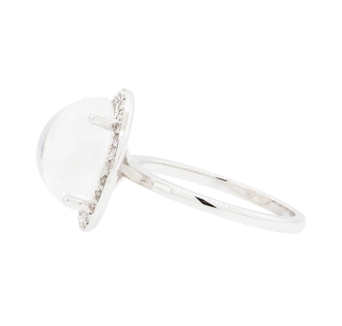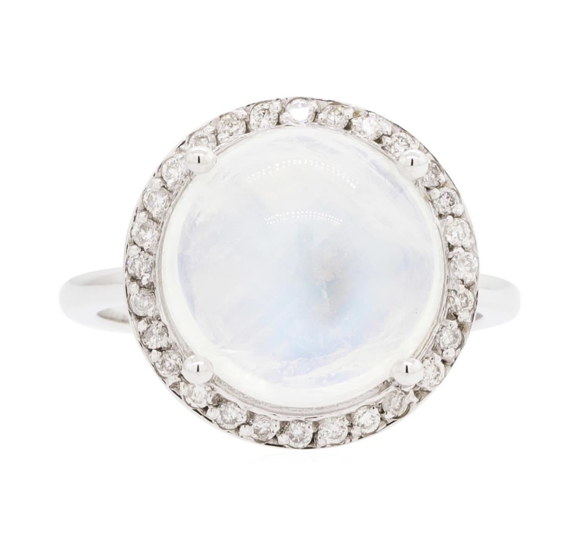 One lady's ring featuring: 14KT white gold weighing 4.9 grams containing one moonstone weighing 6.93ct and diamonds weighing 0.28ctw. The ring is a size 6.5.