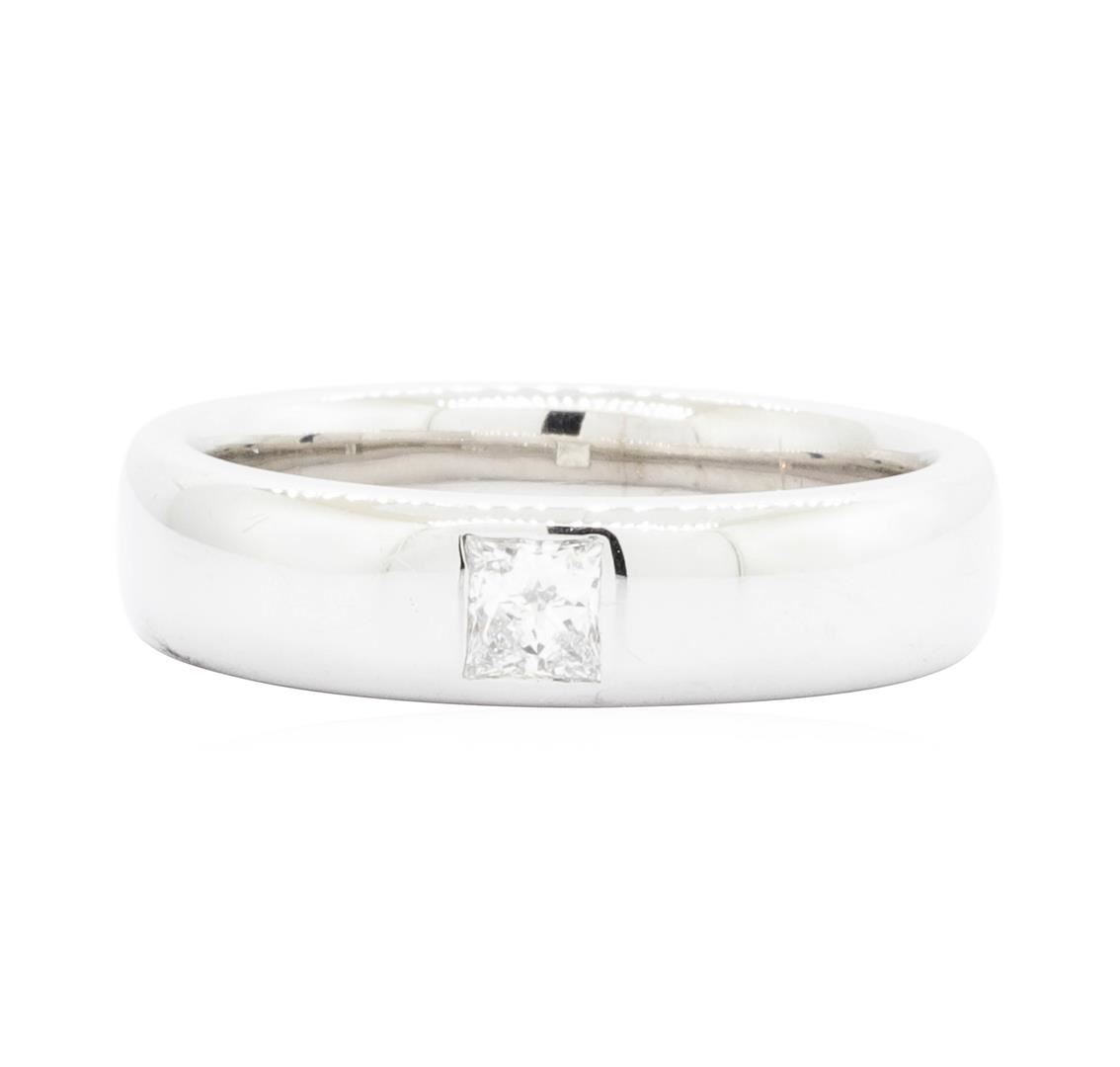 One electronically tested 14KT white gold man's cast wedding band with a bright polish finish. The featured man's ring has a shank measuring 5.42 millimeters wide. Identified with markings of '14K'. Condition is like new, good workmanship. Containing: One channel set princess cut diamond, measuring 3.90 x 3.80 x 2.40mm (depth est.) approximate weight of 0.30ct. Graded in the setting. Color H Clarity SI-1 Cut Very Good. Total Weight of Diamonds 0.30ct.. Total Weight of Band 9.70gm GAS Appraised.