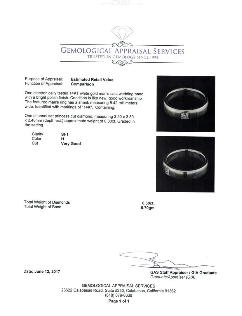 One electronically tested 14KT white gold man's cast wedding band with a bright polish finish. The featured man's ring has a shank measuring 5.42 millimeters wide. Identified with markings of '14K'. Condition is like new, good workmanship. Containing: One channel set princess cut diamond, measuring 3.90 x 3.80 x 2.40mm (depth est.) approximate weight of 0.30ct. Graded in the setting. Color H Clarity SI-1 Cut Very Good. Total Weight of Diamonds 0.30ct.. Total Weight of Band 9.70gm GAS Appraised.