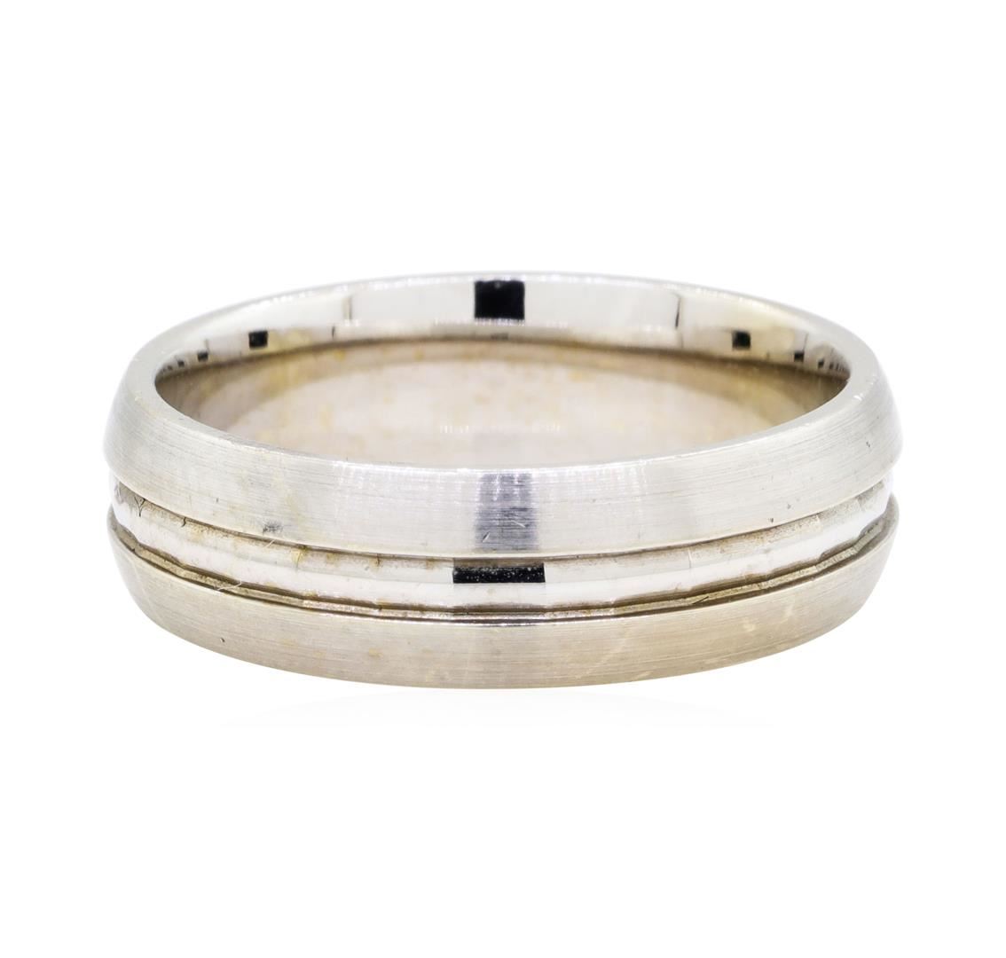One wedding band featuring: 14KT white gold weighing 9.3 grams. The ring is a size 10.5.
