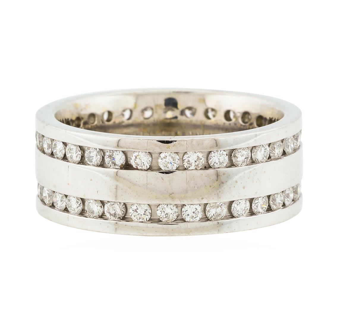 One 14KT White Gold Mens Anniversary Ring with a total weight of 9.3 grams. Approximate total weight of round brillant cut diamonds is 0.75cts.