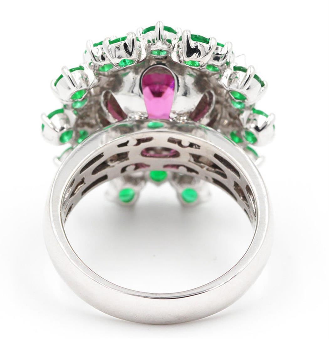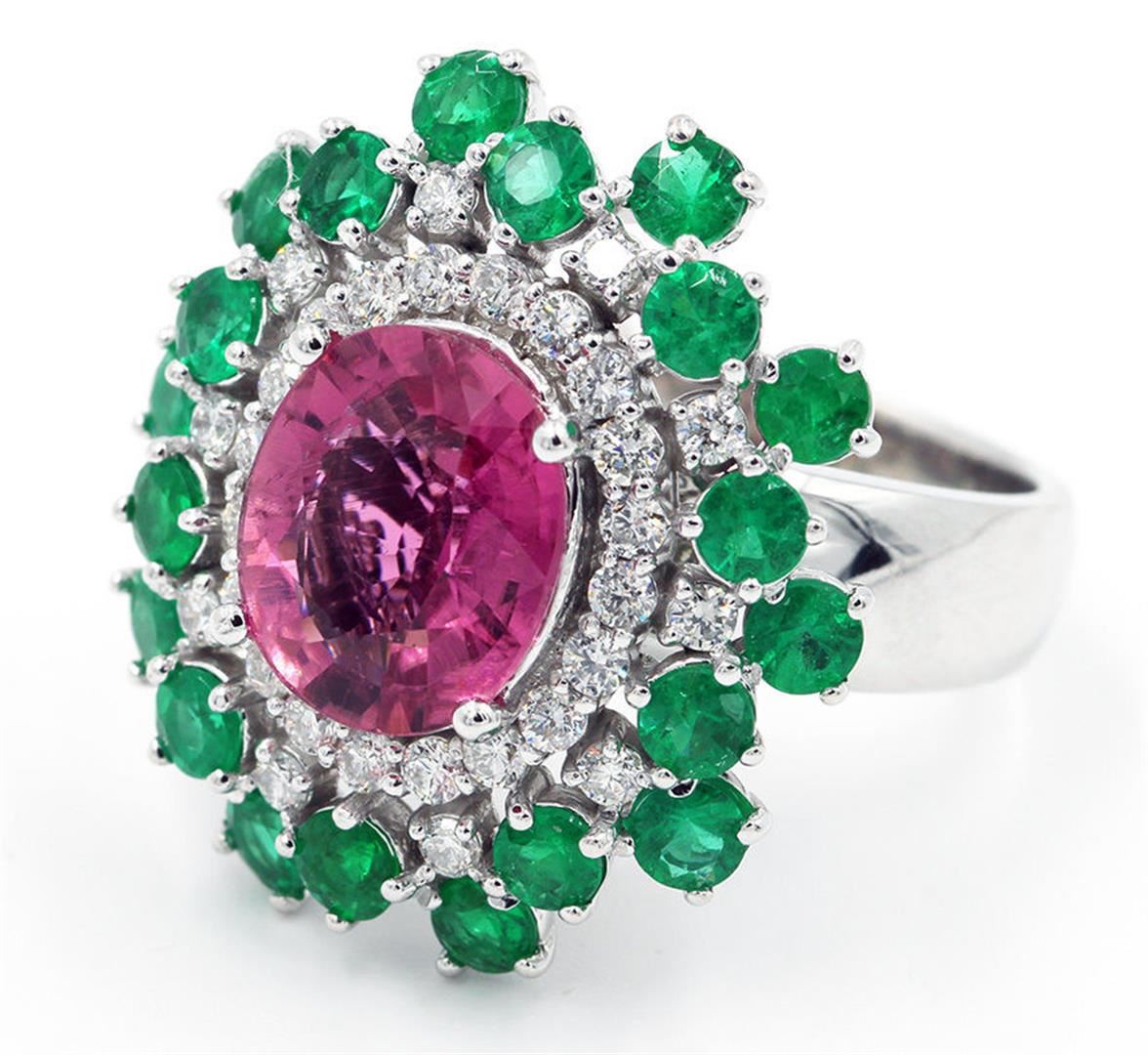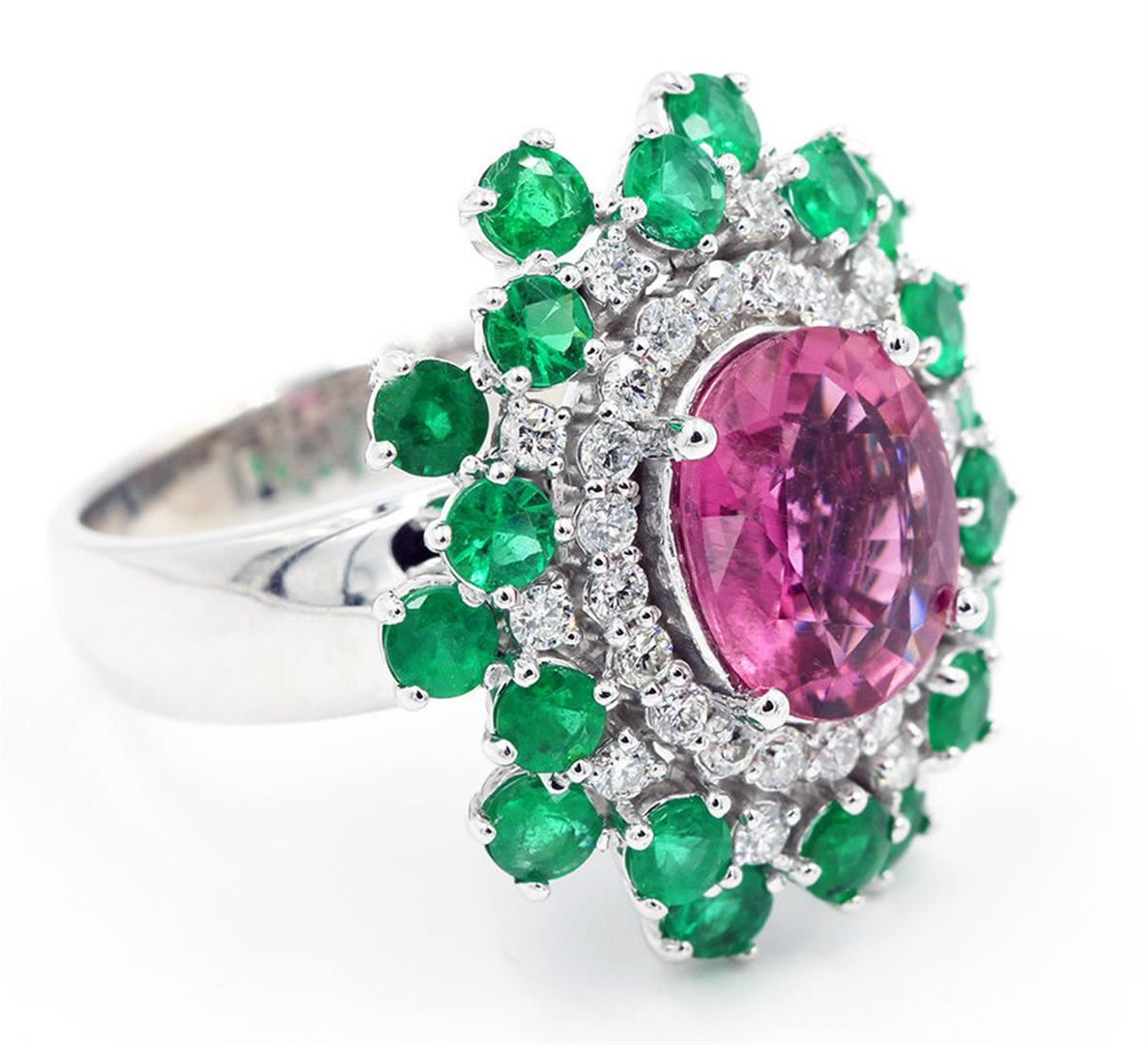 One Oval Cut Pink Tourmaline Diamond Engagement Ring in 14k White Gold. Condition is new. Ring size is 6 but resizable. The ring is at a total of 5.74 Carats. Setting style is solitaire with accents / halo design with white gold metal and purity of 14k. Gross weight is 9.80 grams with a total of 51 stones. The main stone treatment is non-enhanced / natural. Main stone is pink tourmaline, shape is oval, clarity fine bright, color natural pink, and cut is very good with it being 2.66 carats. Side stones specifications: stones are non-enhanced/natural. The diamond shape is brilliant round cut with SI1 clarity, G-H color, and cut being very good. Total of 30 diamonds on the side equating 0.88 ct. Side emerald shape is round cut with a total of 2.20 carats. Total of 20 emeralds on the side.
