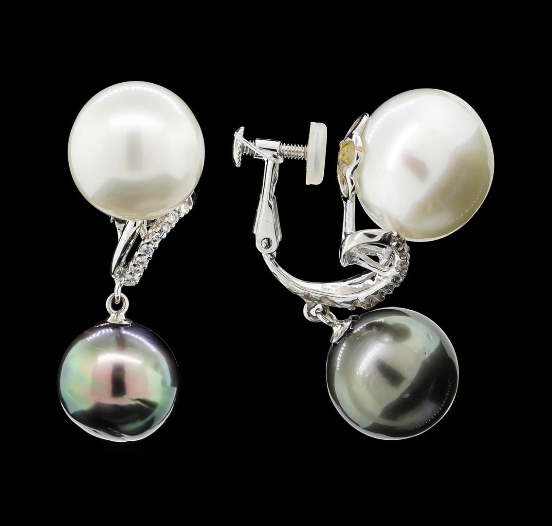 One pair electronically tested 14KT white gold lady's combination cast & assembled fashion dangle earrings with spring hinged clip backs with a bright polish finish. The featured lady's earrings have a drop of 38.5 millimeters. Identified with markings of "K14". Condition is new, good workmanship. Containing: Two freshwater cultured pearls, 13.3mm to 13.2mm in size. The pearls are white in color with a good luster, near round, and mostly clean with very good matching. Graded in the setting. Two Tahitian pearls, 12.0mm to 11.6mm in size. The pearls are black in color, green overtone with a good luster, near round, and mostly clean with very good matching. The featured Tahitian pearls have been drilled through. Graded in the setting. Eighteen prong set round brilliant cut diamonds, measuring 1.35 - 1.25 x 0.81mm (depth est.) approximate total weight of 18 Stones = 0.15ct. Graded in the setting. Clarity: VS-2 to SI-1. Color: G - HCut Good. Total Weight of Diamonds 0.15ct. Total Weight of Earrings 13.80gm. GAS Appraised at $3,930.00.