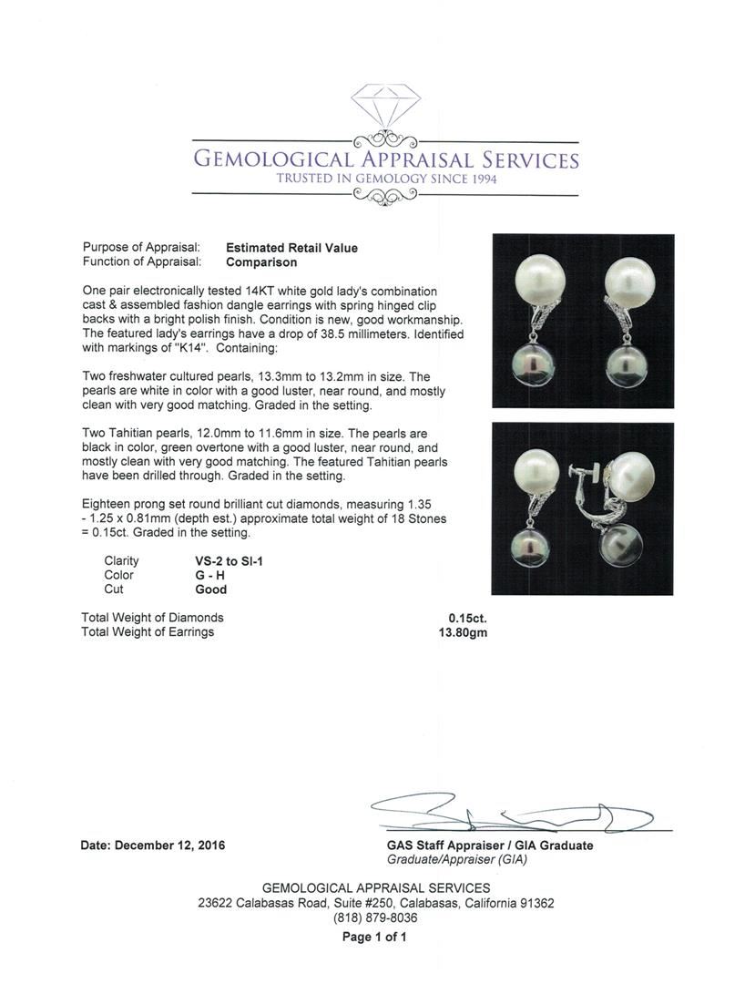 One pair electronically tested 14KT white gold lady's combination cast & assembled fashion dangle earrings with spring hinged clip backs with a bright polish finish. The featured lady's earrings have a drop of 38.5 millimeters. Identified with markings of "K14". Condition is new, good workmanship. Containing: Two freshwater cultured pearls, 13.3mm to 13.2mm in size. The pearls are white in color with a good luster, near round, and mostly clean with very good matching. Graded in the setting. Two Tahitian pearls, 12.0mm to 11.6mm in size. The pearls are black in color, green overtone with a good luster, near round, and mostly clean with very good matching. The featured Tahitian pearls have been drilled through. Graded in the setting. Eighteen prong set round brilliant cut diamonds, measuring 1.35 - 1.25 x 0.81mm (depth est.) approximate total weight of 18 Stones = 0.15ct. Graded in the setting. Clarity: VS-2 to SI-1. Color: G - HCut Good. Total Weight of Diamonds 0.15ct. Total Weight of Earrings 13.80gm. GAS Appraised.
