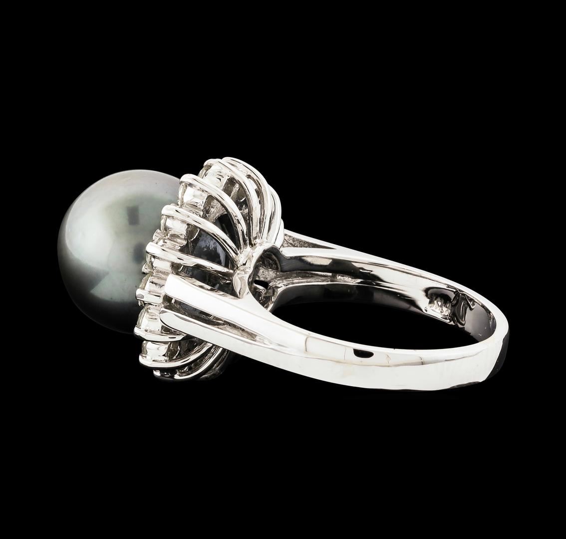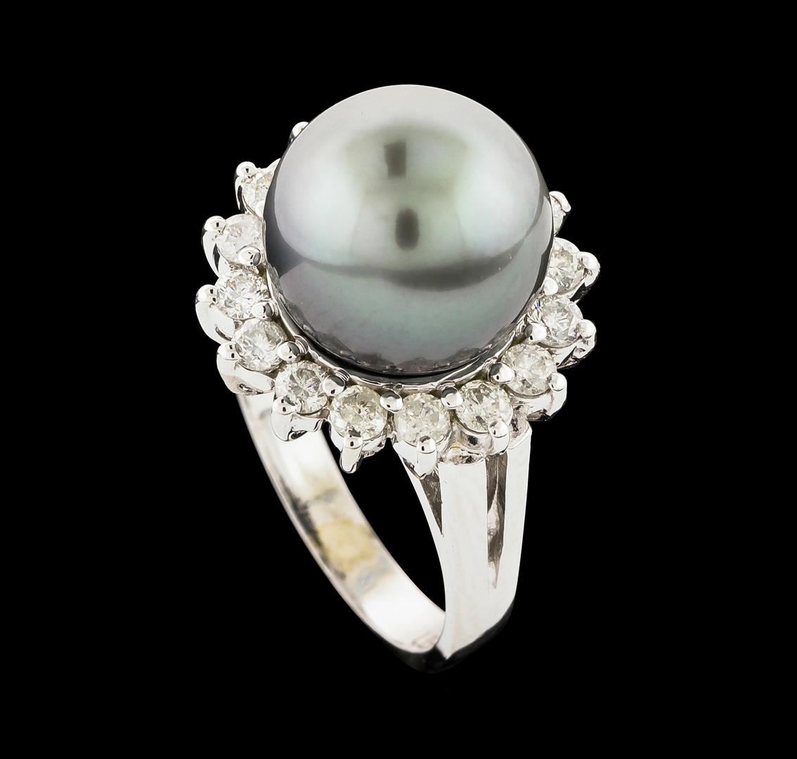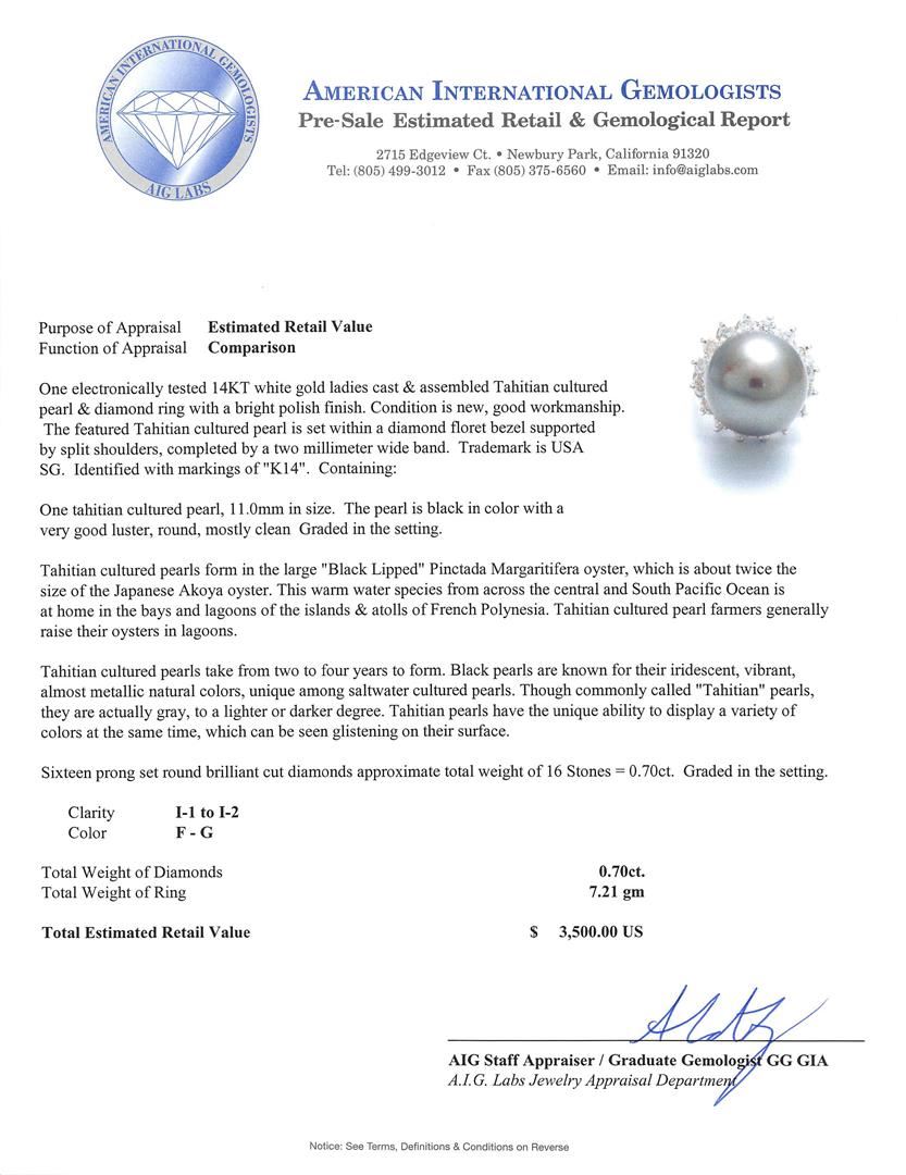 One electronically tested 14KT white gold ladies cast & assembled Tahitian cultured pearl & diamond ring with a bright polish finish. The featured Tahitian cultured pearl is set within a diamond floret bezel supported by split shoulders, completed by a two millimeter wide band. Trademark is USA SG. Identified with markings of "K14". Condition is new, good workmanship. Containing: One Tahitian cultured pearl, 11.0mm in size. The pearl is black in color with a very good luster, round, mostly clean Graded in the setting. Tahitian cultured pearls form in the large "Black Lipped" Pinctada Margaritifera oyster, which is about twice the size of the Japanese Akoya oyster. This warm water species from across the central and South Pacific Ocean is at home in the bays and lagoons of the islands & atolls of French Polynesia. Tahitian cultured pearl farmers generally raise their oysters in lagoons. Tahitian cultured pearls take from two to four years to form. Black pearls are known for their iridescent, vibrant, almost metallic natural colors, unique among saltwater cultured pearls. Though commonly called "Tahitian" pearls, they are actually gray, to a lighter or darker degree. Tahitian pearls have the unique ability to display a variety of colors at the same time, which can be seen glistening on their surface. Sixteen prong set round brilliant cut diamonds approximate total weight of 16 Stones = 0.70ct. Graded in the setting. Clarity: I-1 to I-2. Color: F - G. Total Weight of Diamonds 0.70ct. Total Weight of Ring 7.21gm. AIG Appraised at $3,500.00.
