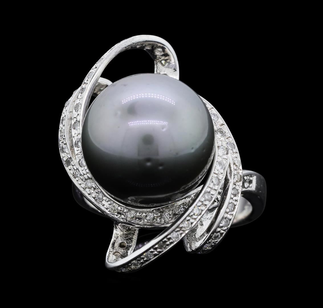 One electronically tested 14KT white gold ladies cast Tahitian cultured pearl and diamond ring with a bright polish finish. The featured Tahitian cultured pearl is set within intertwining diamond ribbons supported by diamond set shoulders, completed by a three millimeter wide band. Identified with markings of "K14". Condition is new, good workmanship. Containing: One Tahitian cultured pearl, 13.5mm in size. The pearl is dark silver in color with a very good luster, round to near round, mostly clean Graded in the setting. Tahitian cultured pearls form in the large "Black Lipped" Pinctada Margaritifera oyster, which is about twice the size of the Japanese Akoya oyster. This warm water species from across the central and South Pacific Ocean is at home in the bays and lagoons of the islands & atolls of French Polynesia. Tahitian cultured pearl farmers generally raise their oysters in lagoons. Tahitian cultured pearls take from two to four years to form. Black pearls are known for their iridescent, vibrant, almost metallic natural colors, unique among saltwater cultured pearls. Though commonly called "Tahitian" pearls, they are actually gray, to a lighter or darker degree. Tahitian pearls have the unique ability to display a variety of colors at the same time, which can be seen glistening on their surface. Seventy-Two bead set round brilliant cut diamonds approximate total weight of 72 Stones = 0.38ct. Graded in the setting. Clarity: SI-2 to I-1. Color: G - I. Total Weight of Diamonds 0.38ct. Total Weight of Ring 8.83gm. AIG Appraised.