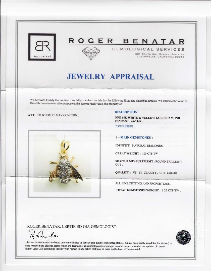 Containing 14KT White and Yellow Gold pendant weighing approximately 4.63 grams. Total diamond weight of approximately 1.00ctw, Clarity: VS-SI Clarity, and Color: G-H. RBGS Appraised.