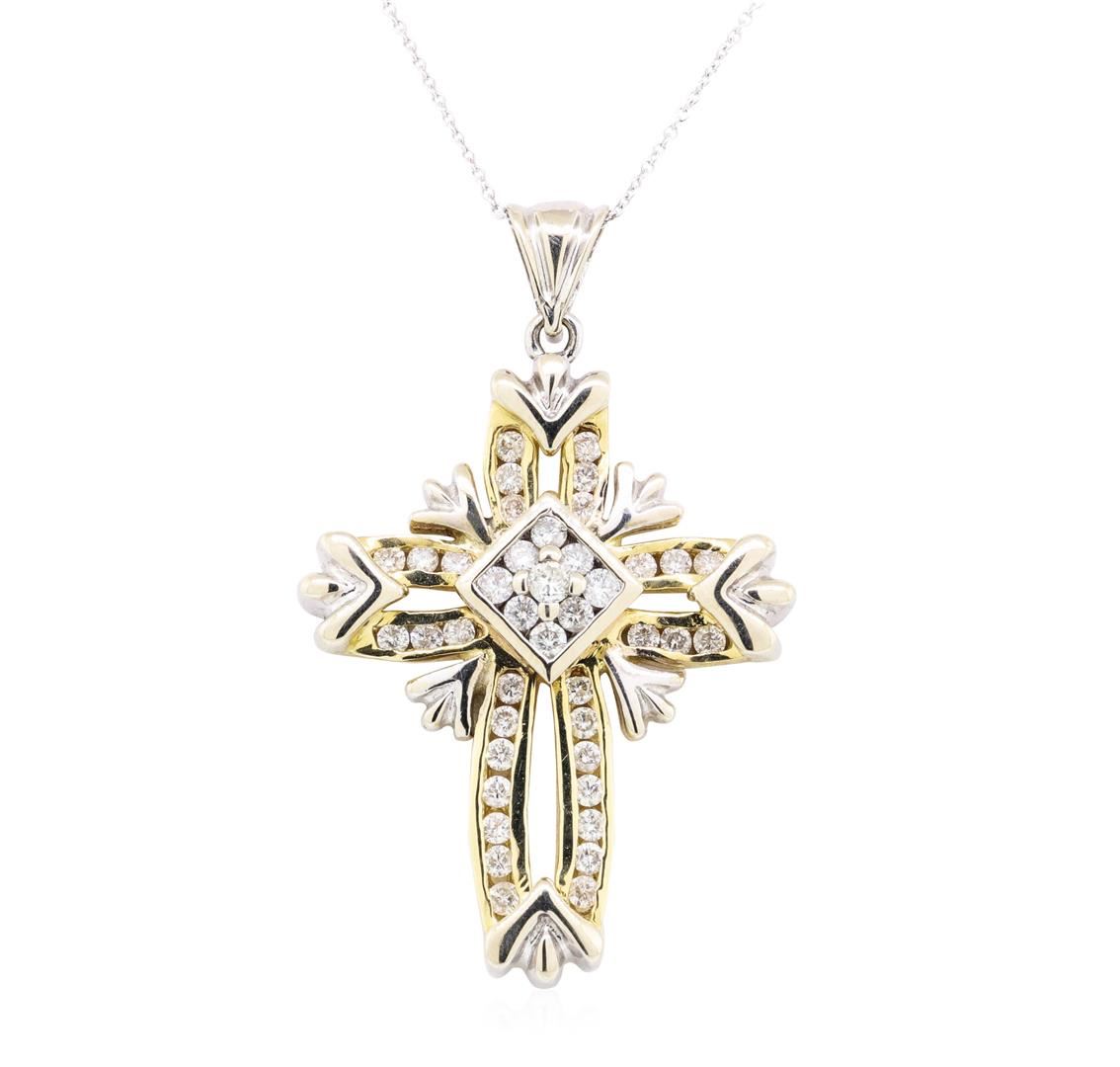 One electronically tested 14KT white and yellow gold Ladies combination cast & assembled fashion cross pendant & chain 18.0' long, 1mm round cable link with a spring ring clasp with a bright polish finish. Identified with markings of '14K'. Condition is new, good workmanship. Containing: Forty-One prong set round brilliant cut diamonds, measuring 2.40 - 2.00 x 1.36mm (depth est.) approximate total weight of 41 Stones = 1.50ct. Graded in the setting. Color H - J Clarity I-1 to I-2 Cut Good. Total Weight of Diamonds 1.50ct.. Total Weight of Pendant & Chain 16.10gm. GAS Appraised.