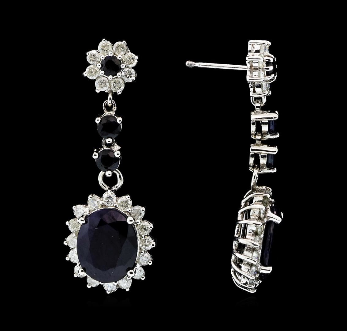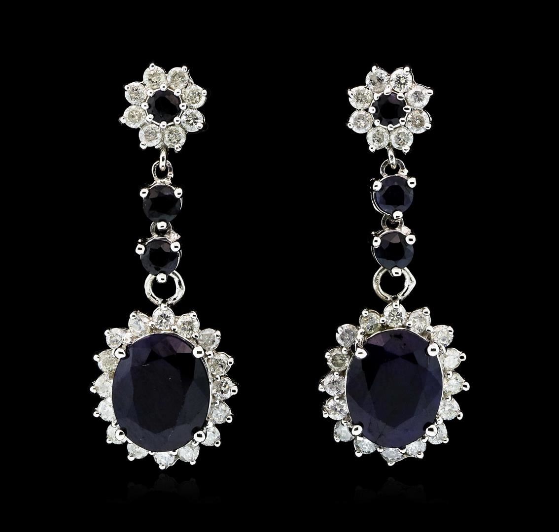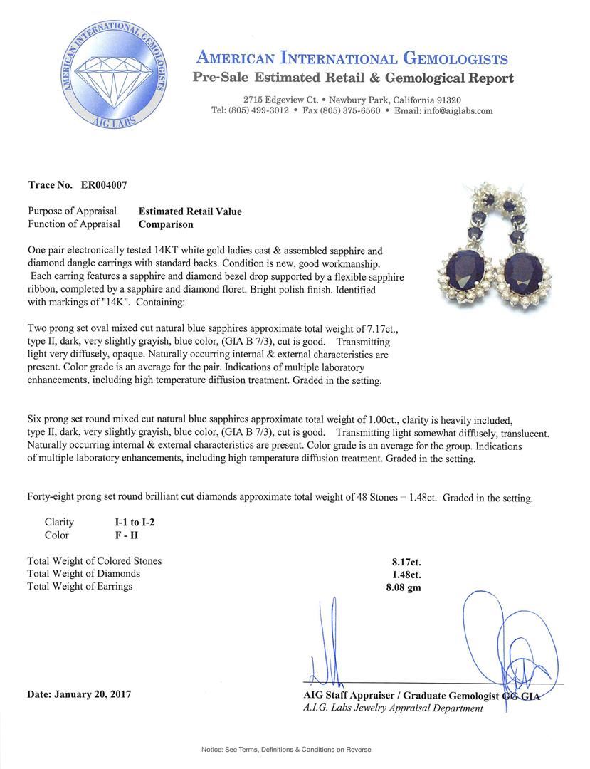 One pair electronically tested 14KT white gold ladies cast & assembled sapphire and diamond dangle earrings with standard backs. Each earring features a sapphire and diamond bezel drop supported by a flexible sapphire ribbon, completed by a sapphire and diamond floret. Bright polish finish. Identified with markings of "14K". Condition is new, good workmanship. Containing: Two prong set oval mixed cut natural blue sapphires approximate total weight of 7.17ct., type II, dark, very slightly grayish, blue color, (GIA B 7/3), cut is good. Transmitting light very diffusely, opaque. Naturally occurring internal & external characteristics arepresent. Color grade is an average for the pair. Indications of multiple laboratoryenhancements, including high temperature diffusion treatment. Graded in the setting.Six prong set round mixed cut natural blue sapphires approximate total weight of 1.00ct., clarity is heavily included, type II, dark, very slightly grayish, blue color, (GIA B 7/3), cut is good. Transmitting light somewhat diffusely, translucent. Naturally occurring internal & external characteristics are present. Color grade is an average for the group. Indications of multiple laboratory enhancements, including high temperature diffusion treatment. Graded in the setting.Forty-Eight prong set round brilliant cut diamonds approximate total weight of 48 Stones = 1.48ct. Graded in the setting. Clarity: I-1 to I-2. Color: F - H. Total Weight of Colored Stones 8.17ct. Total Weight of Diamonds 1.48ct. Total Weight of Earrings 8.08gm. AIG Appraised.
