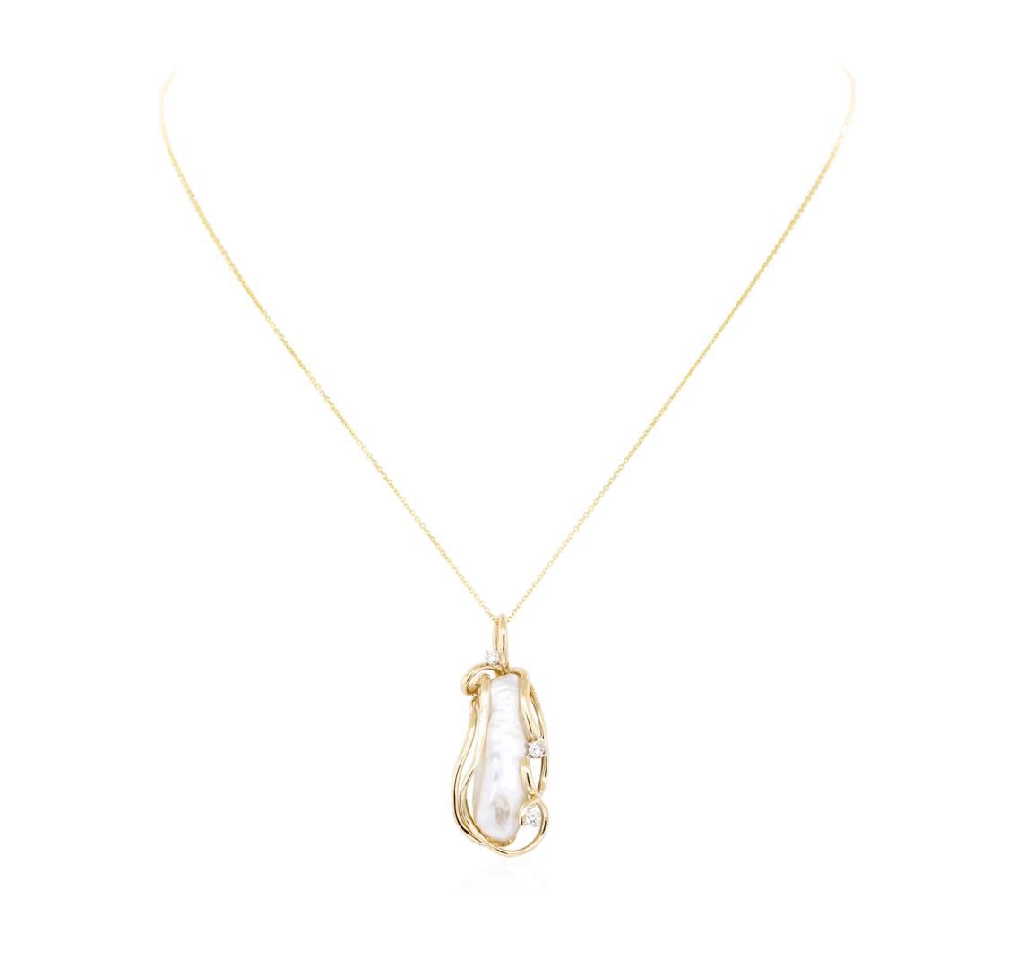 One pendant with a sixteen inch long 0.7mm diamond cut cable link chain featuring: 14KT yellow gold weighing 6.6 grams containing one freeform freshwater pearl and diamonds weighing 0.10ctw.