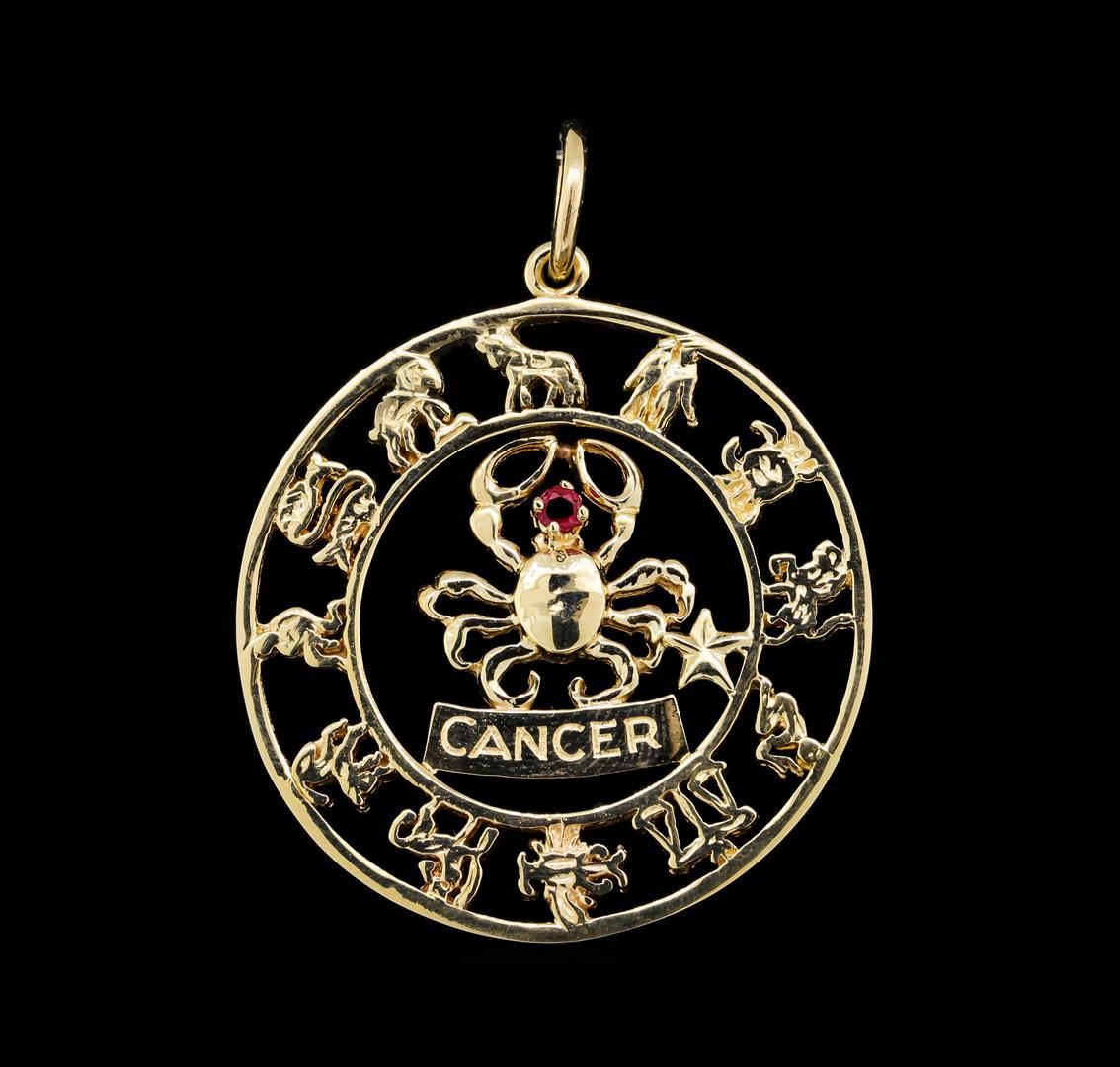 One Ladies Cancer zodiac pendant featuring: 14KT yellow gold weighing 11.4 grams containing one ruby weighing 0.10ct.