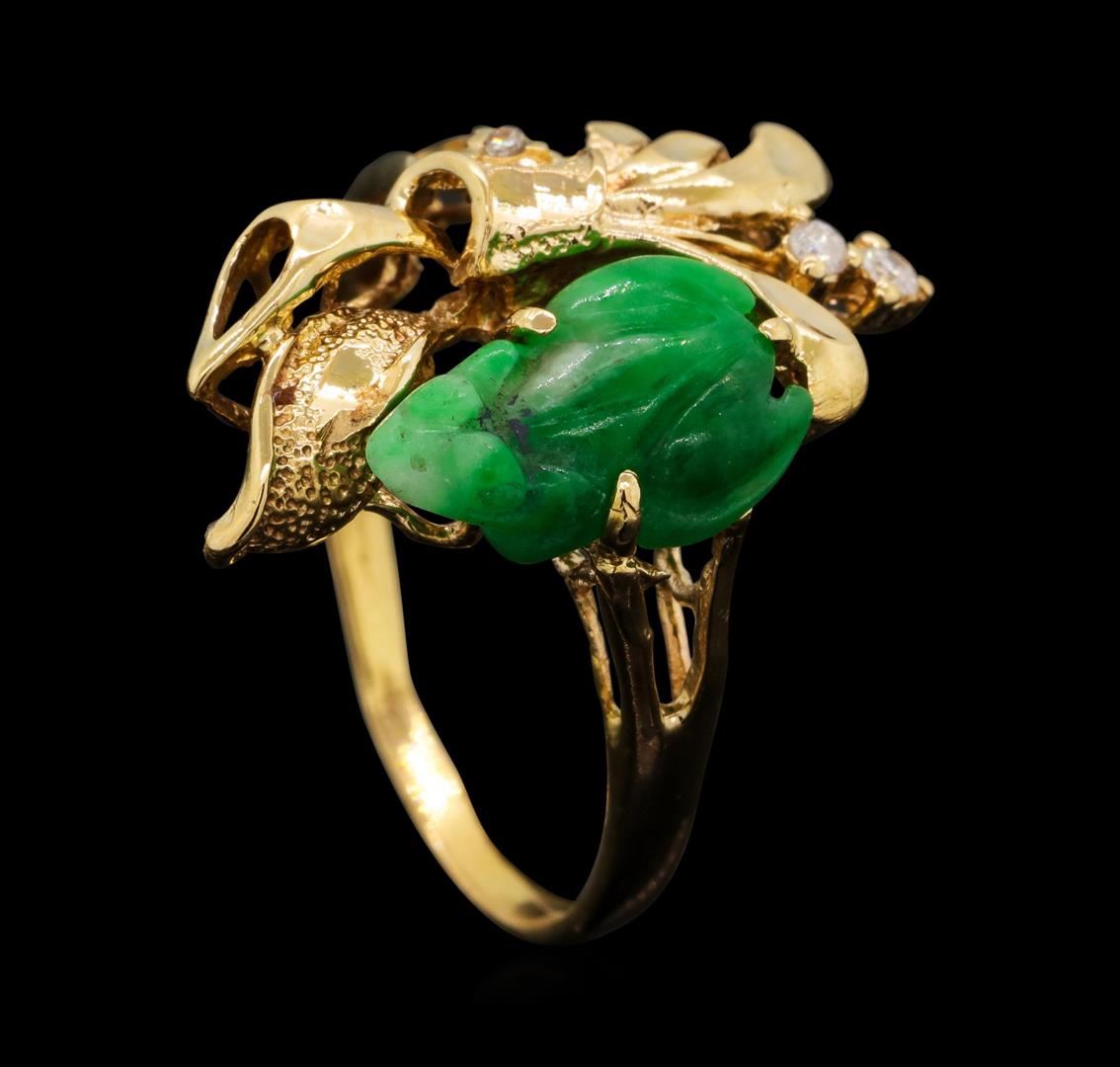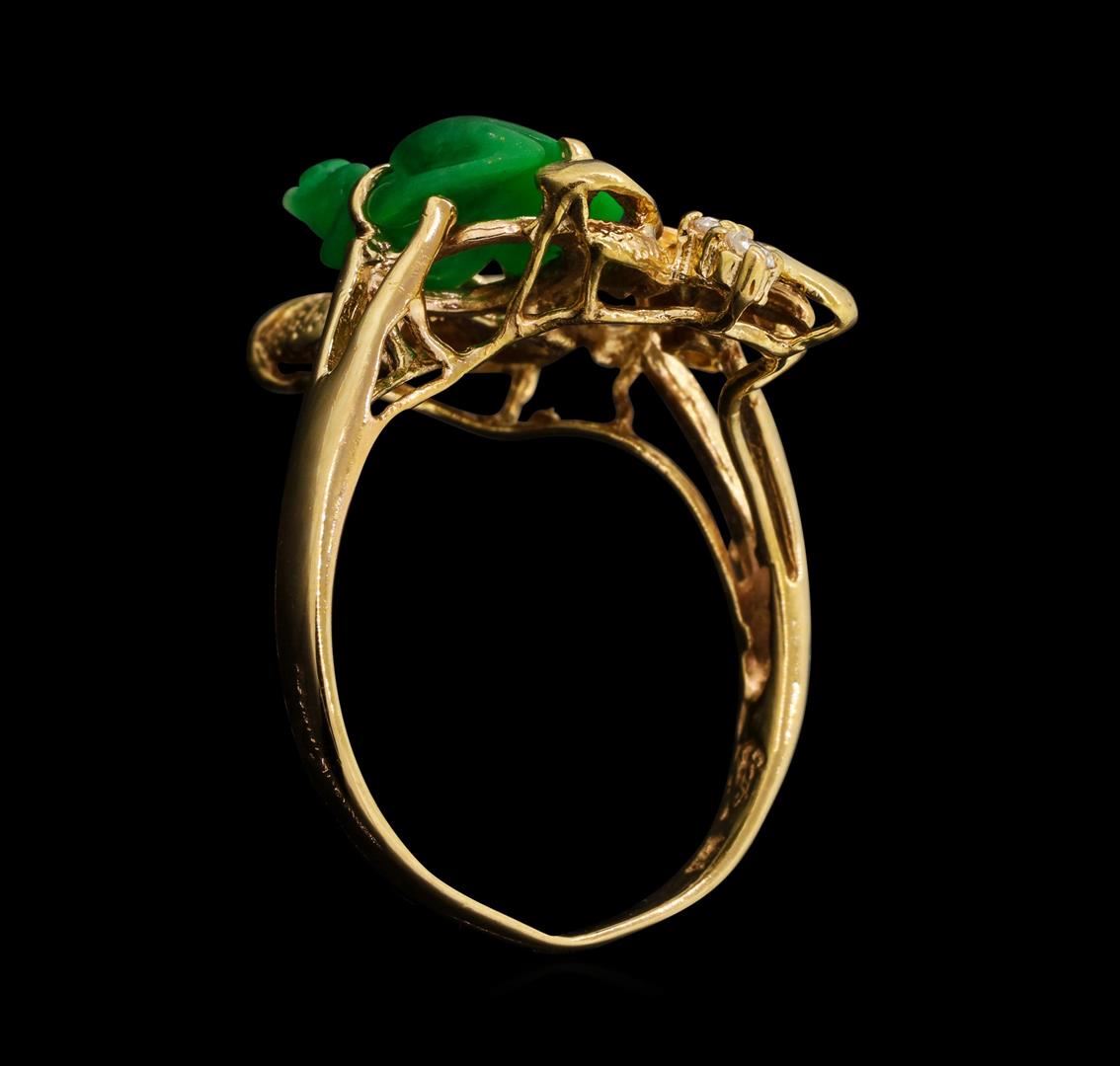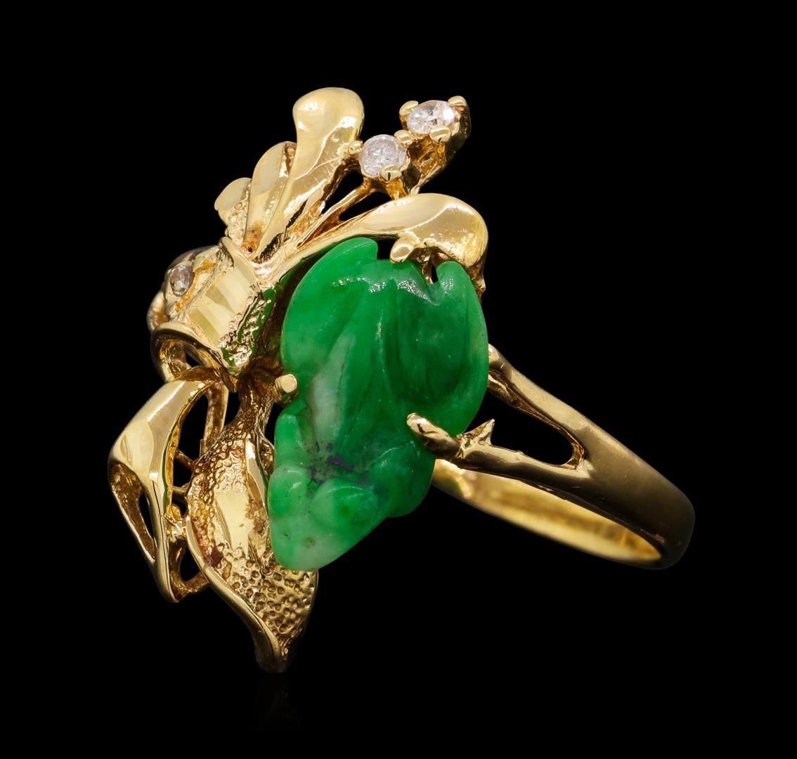 One lady's ring featuring: 14KT yellow gold weighing 3.4 grams containing three diamonds weighing 0.10ctw and one piece of jade carved into a frog motif. The ring is a size 6.5.