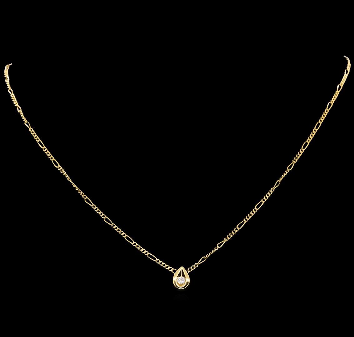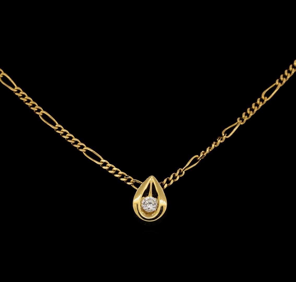 One lady's pendant with chain featuring: 14KT yellow gold weighing 5.1 grams containing one diamond weighing 0.13ct. The attached figaro chain measures approximately 20 inches long.
