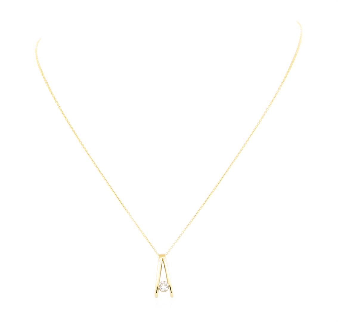 One pendant with chain featuring: 14KT yellow gold weighing 3.4 grams containing one diamond weighing 0.22ct. The cable link chain measures approximately sixteen inches in length.