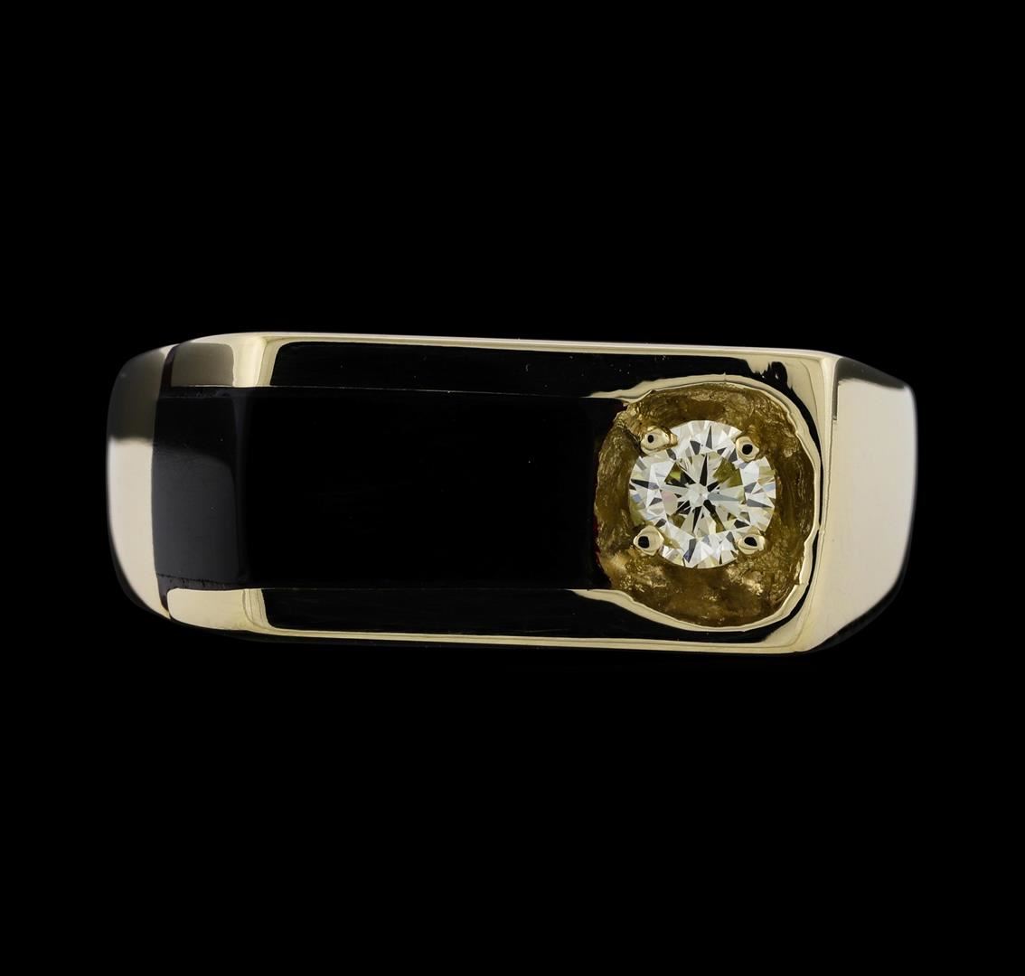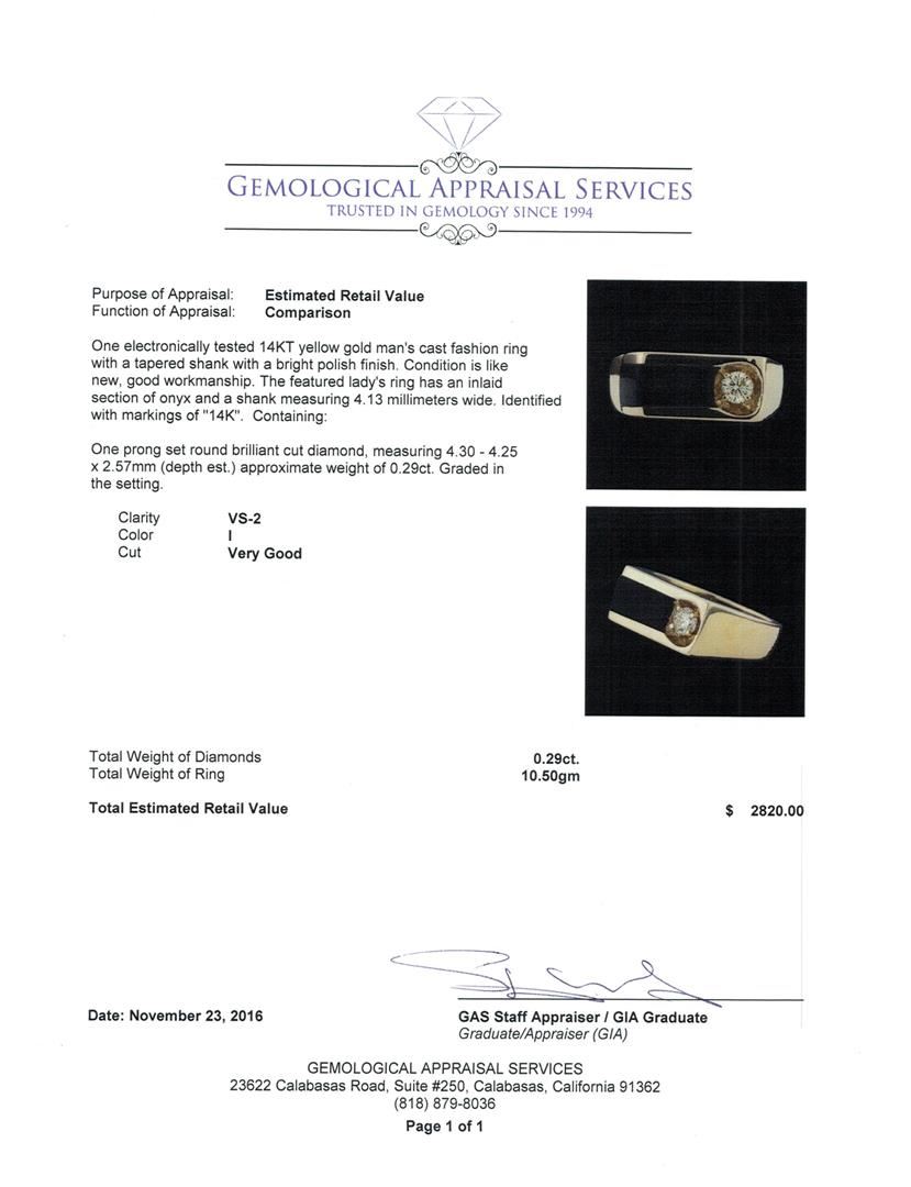 One electronically tested 14KT yellow gold man's cast fashion ring with a tapered shank with a bright polish finish. The featured lady's ring has an inlaid section of onyx and a shank measuring 4.13 millimeters wide. Identified with markings of "14K". Condition is like new, good workmanship. Containing: One prong set round brilliant cut diamond, measuring 4.30 - 4.25 x 2.57mm (depth est.) approximate weight of 0.29ct. Graded in the setting. Clarity: VS-2. Color: ICut Very Good. Total Weight of Diamonds 0.29ct. Total Weight of Ring 10.50gm. GAS Appraised at $2,820.00.