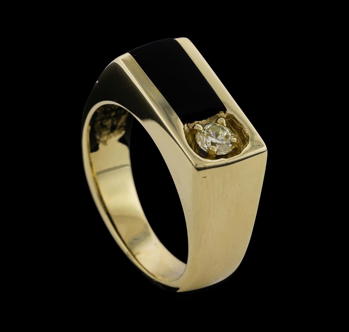 One electronically tested 14KT yellow gold man's cast fashion ring with a tapered shank with a bright polish finish. The featured lady's ring has an inlaid section of onyx and a shank measuring 4.13 millimeters wide. Identified with markings of "14K". Condition is like new, good workmanship. Containing: One prong set round brilliant cut diamond, measuring 4.30 - 4.25 x 2.57mm (depth est.) approximate weight of 0.29ct. Graded in the setting. Clarity: VS-2. Color: ICut Very Good. Total Weight of Diamonds 0.29ct. Total Weight of Ring 10.50gm. GAS Appraised.