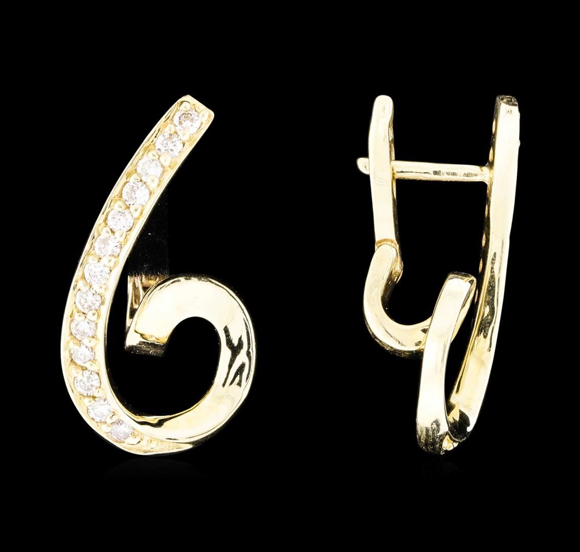One pair electronically tested 14KT yellow gold lady's cast fashion swirl earrings with hinged, snap locking posts with a bright polish finish. Identified with markings of "14K". Condition is new, good workmanship. Containing: Twenty-Six prong set round brilliant cut diamonds, measuring 1.55 - 1.45 x 0.93mm (depth est.) approximate total weight of 26 Stones = 0.33ct. Graded in the setting. Clarity: SI-1 to I-1. Color: H - ICut Good. Total Weight of Diamonds 0.33ct. Total Weight of Earrings 4.00gm. GAS Appraised.