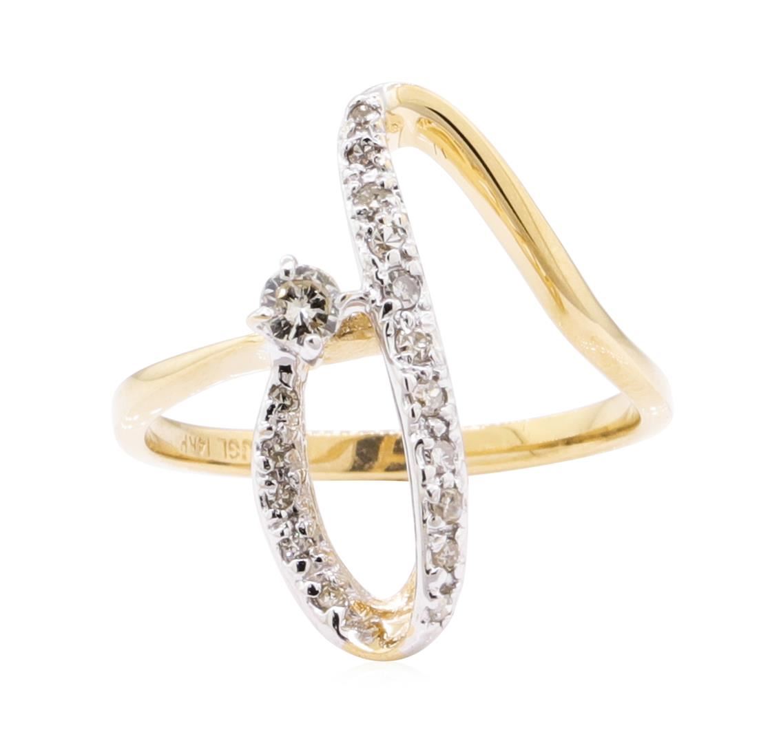 One lady's freeform ring featuring: 14KT yellow gold with rhodium plating weighing 3.1 grams containing diamonds weighing 0.35ctw. The ring is a size 7.5.