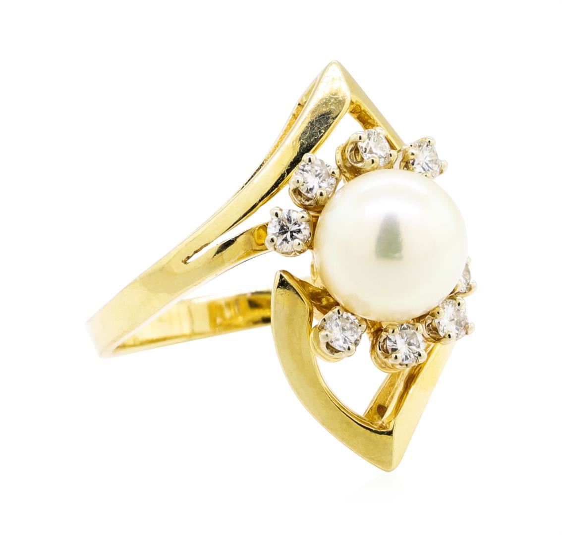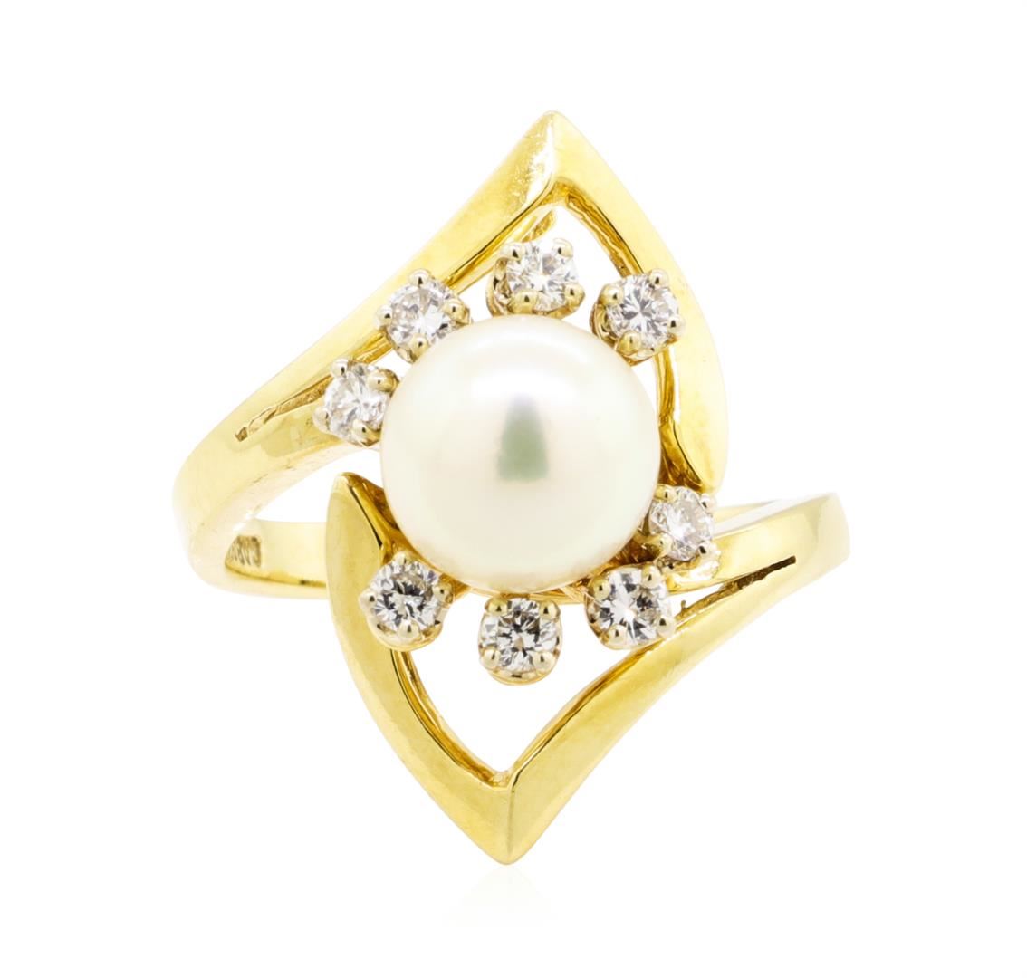One ring featuring: 14KT yellow gold weighing 6.3 grams containing diamonds weighing 0.40ctw and one cultured pearl measuring 8.4 millimeters. The ring is a size 7.