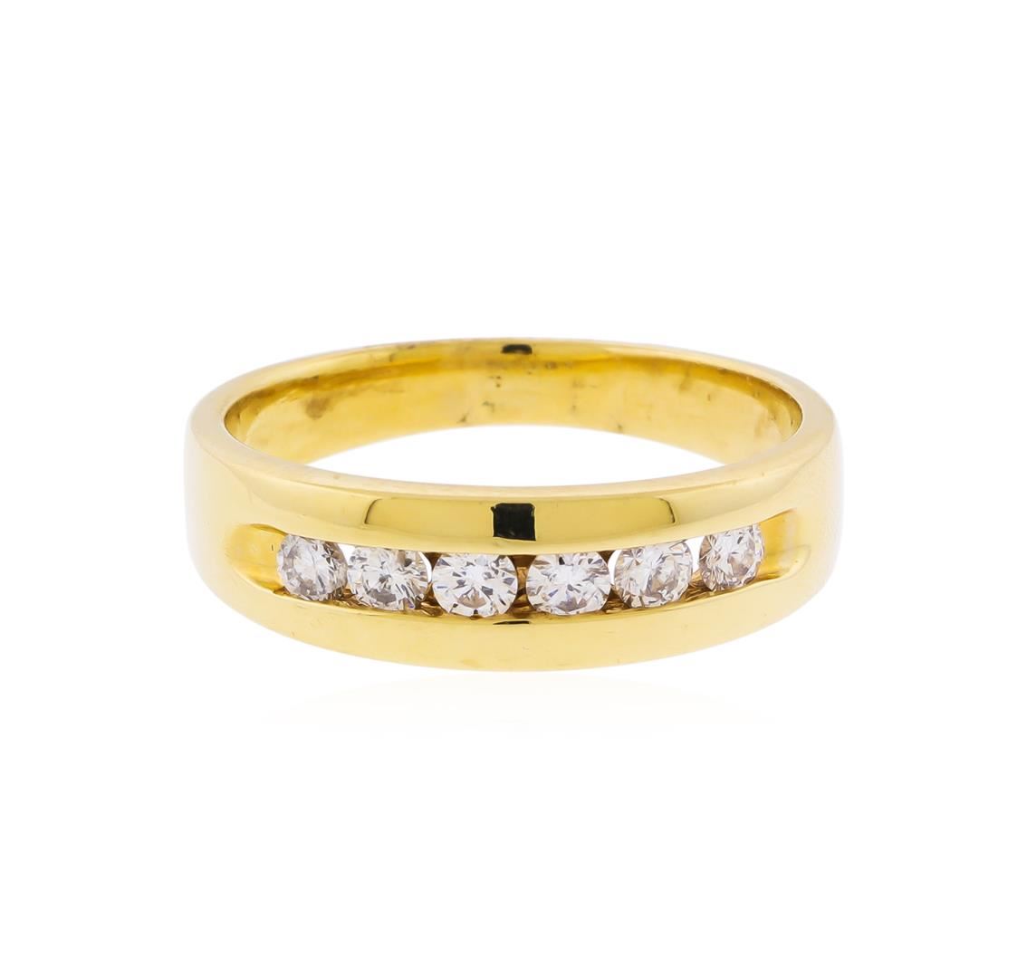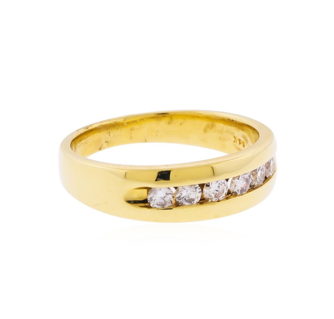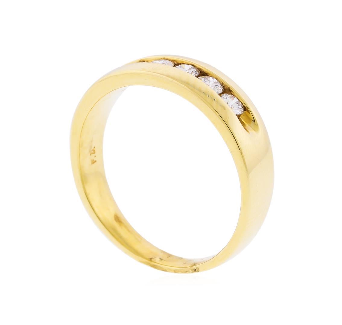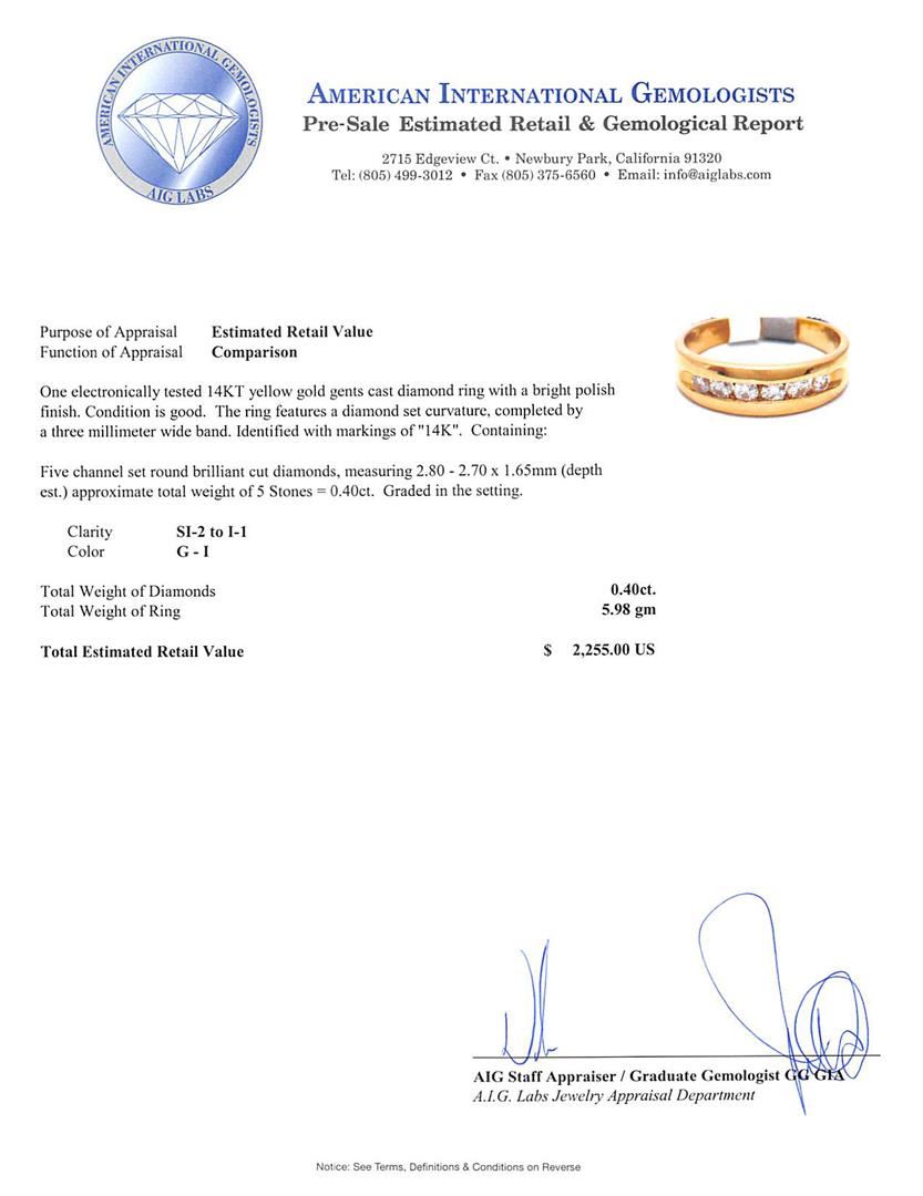 One electronically tested 14KT yellow gold gents cast diamond ring with a bright polish finish. The ring features a diamond set curvature, completed by a three millimeter wide band. Identified with markings of "14K". Condition is good. Containing: Five channel set round brilliant cut diamonds, measuring 2.80 - 2.70 x 1.65mm (depth est.) approximate total weight of 5 Stones = 0.40ct. Graded in the setting. Clarity: SI-2 to I-1. Color: G - I. Total Weight of Diamonds 0.40ct. Total Weight of Ring 5.98gm. AIG Appraised at $2,255.00.