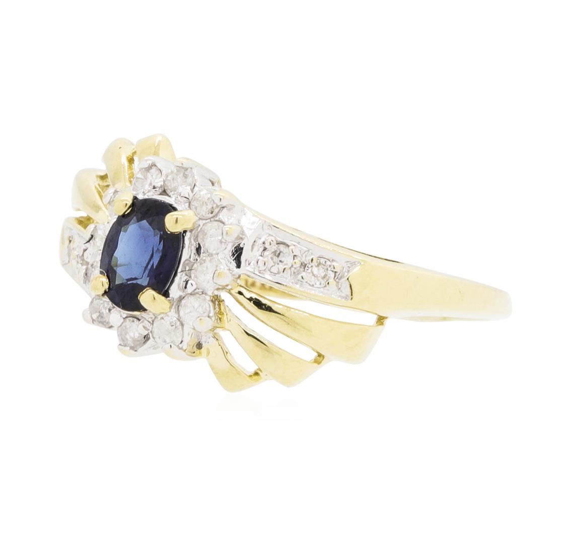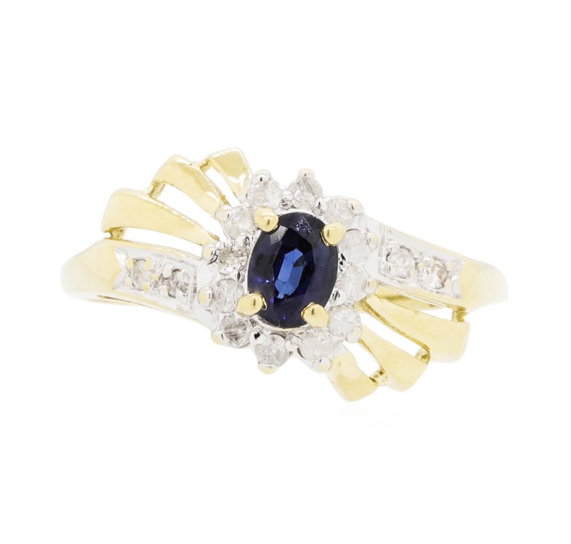 One ring featuring: 14KT yellow gold weighing 2.3 grams containing one sapphire weighing 0.40ct and diamonds weighing 0.25ctw. The ring is a size 6.