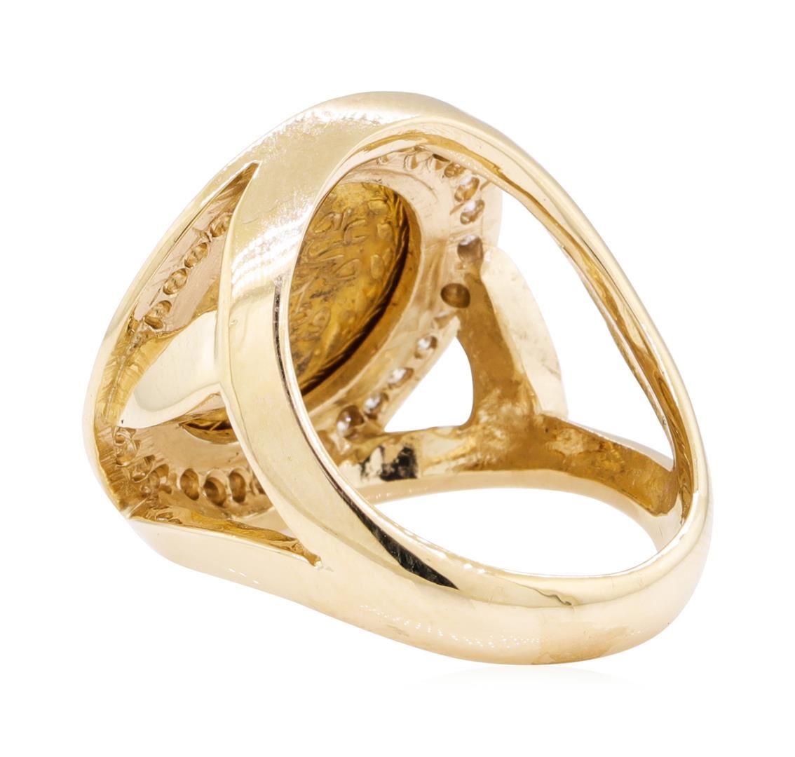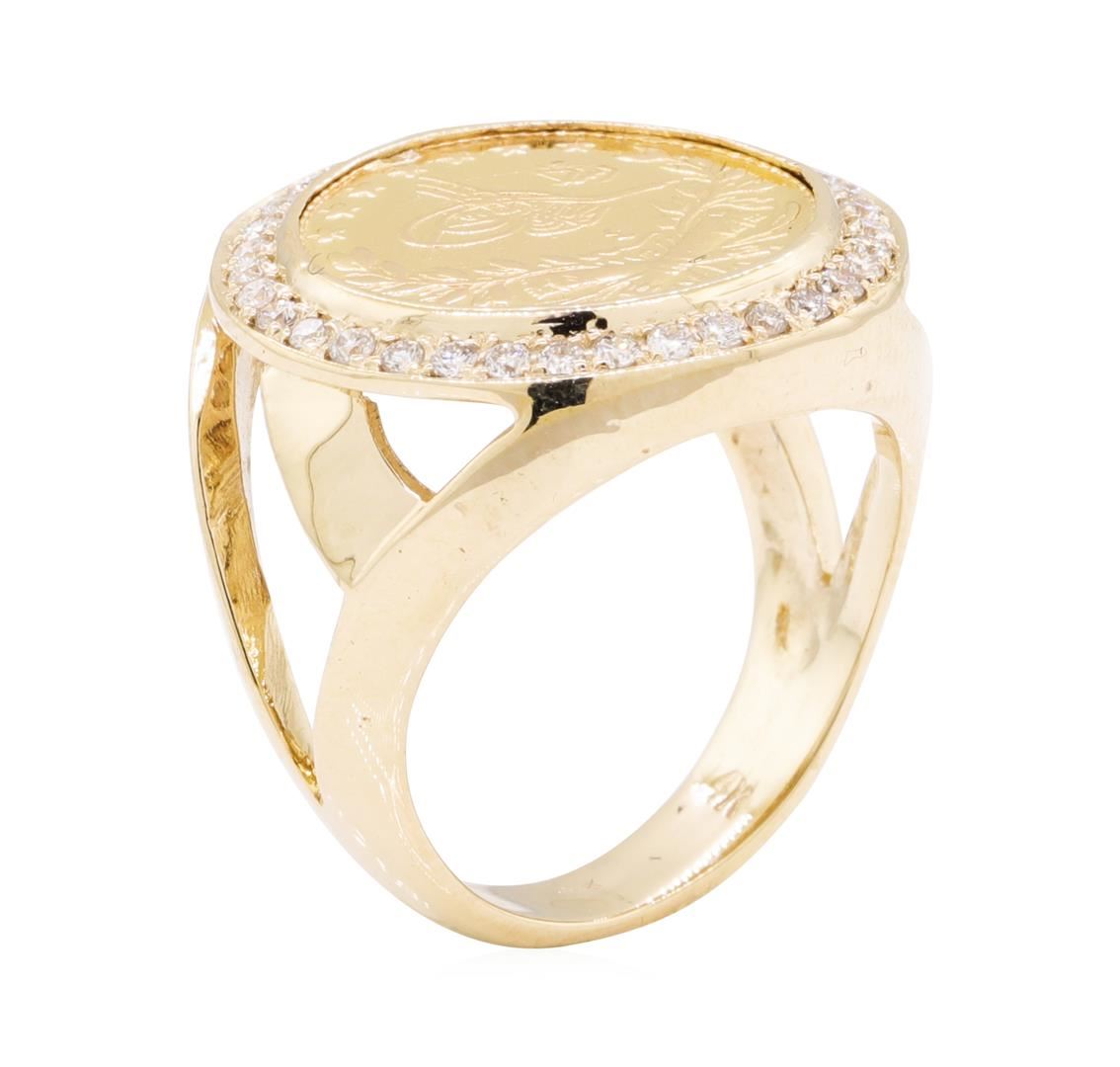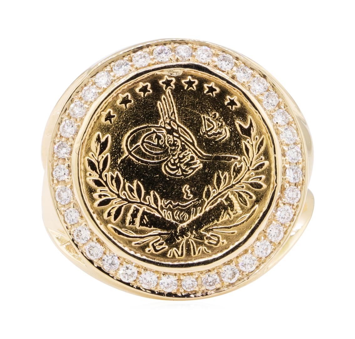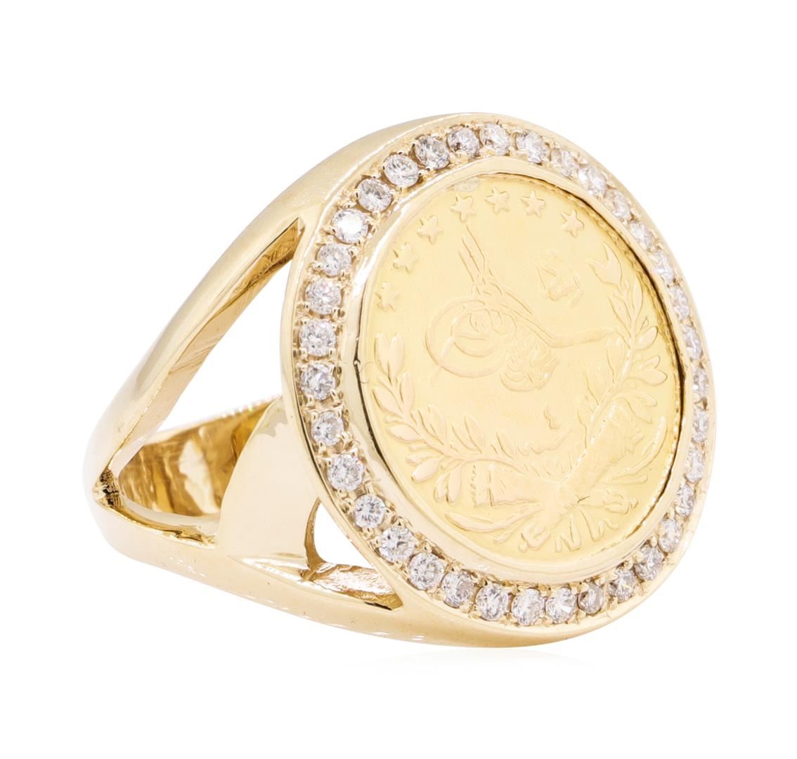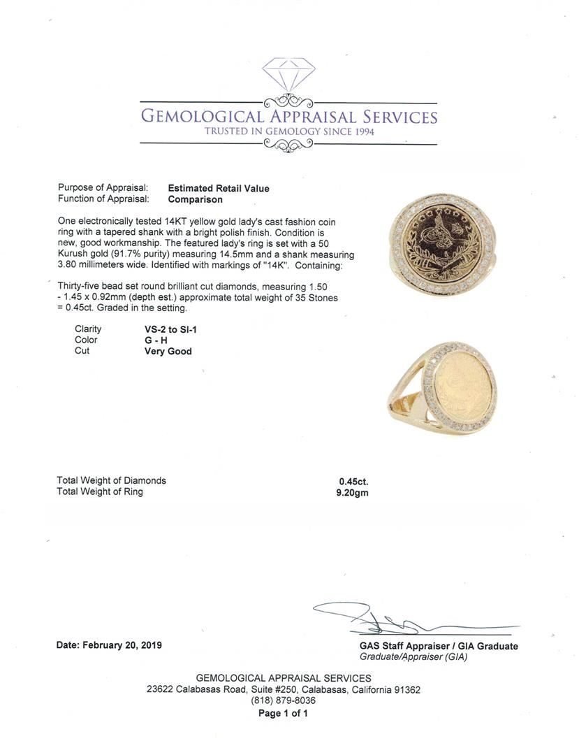 One electronically tested 14KT yellow gold lady's cast fashion coin ring with a tapered shank with a bright polish finish. The featured lady's ring is set with a 50 Kurush gold (91.7%. purity) measuring 14.5mm and a shank measuring 3.80 millimeters wide. Identified with markings of '14K'. Condition is new, good workmanship. Containing: Thirty-Five bead set round brilliant cut diamonds, measuring 1.50 - 1.45 x 0.92mm (depth est.) approximate total weight of 35 Stones = 0.45ct. Graded in the setting. Color G - H, Clarity VS-2 to SI-1, Cut Very Good. Total Weight of Diamonds 0.45ct. Total Weight of Ring 9.20gm. GAS Appraised.