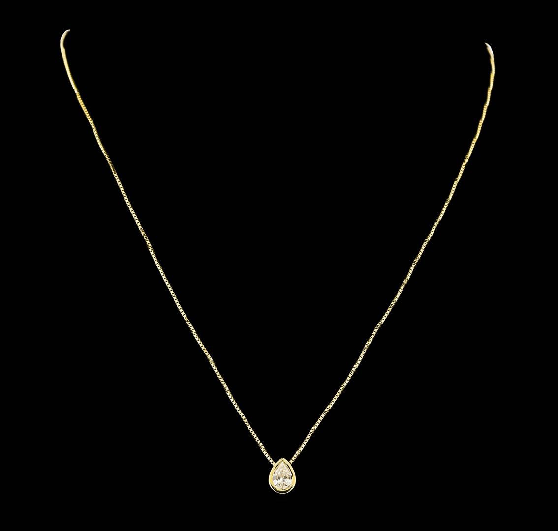 One electronically tested 14KT yellow gold lady's cast fashion pendant & chain 15.0" long, 0.9mm box link with a lobster claw clasp with a pear shaped bezel solitaire with a bright polish finish. Identified with markings of "14K". Condition is new, good workmanship. Containing: One bezel set pear shaped cut diamond, measuring 6.60 x 4.40 x 2.56mm (depth est.) approximate weight of 0.45ct. Graded in the setting. Clarity: I-1. Color: I - JCut Good. Total Weight of Diamonds 0.45ct. Total Weight of Pendant & Chain 2.50gm. GAS Appraised.