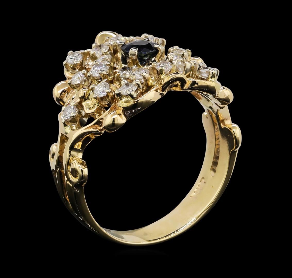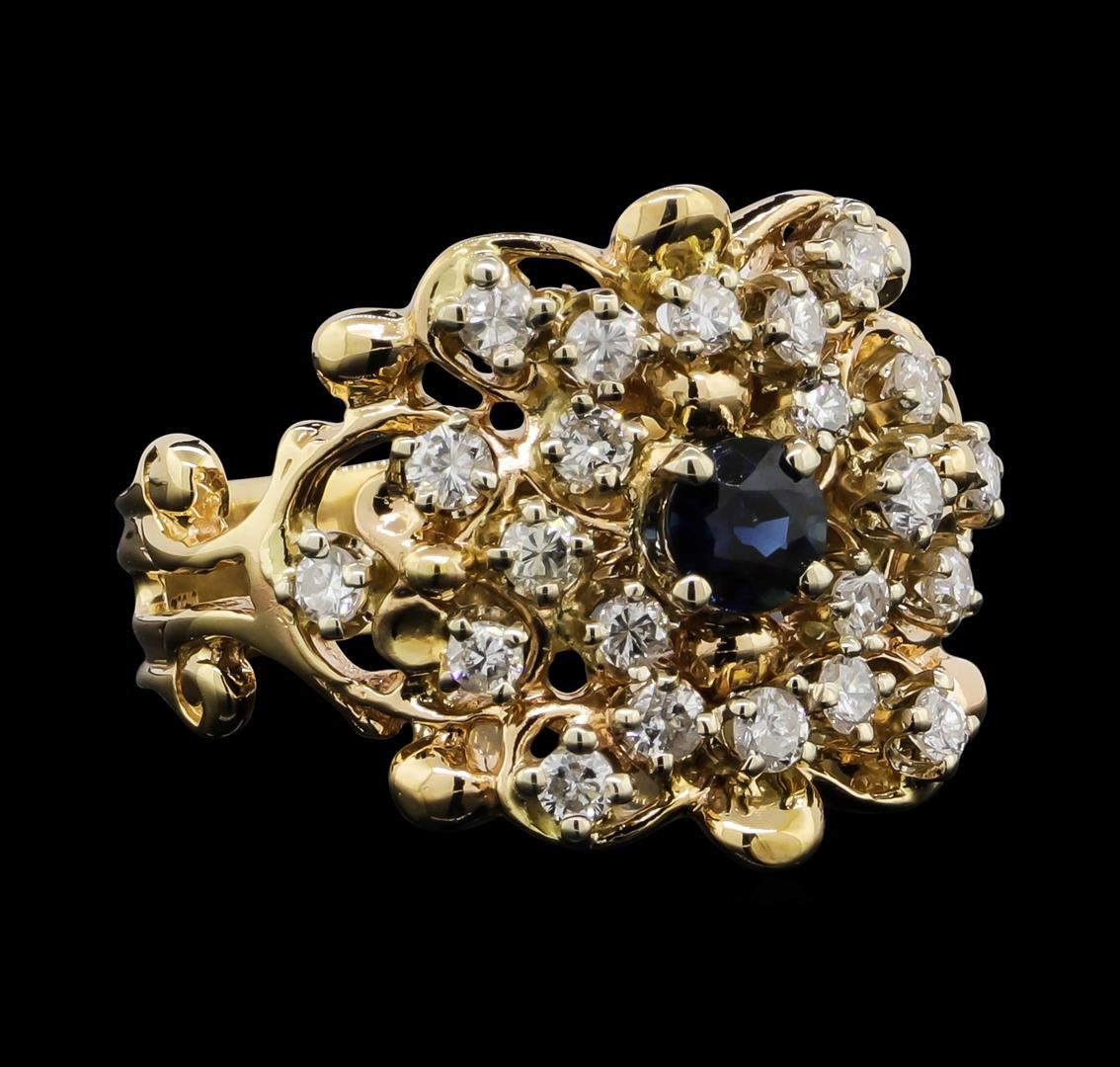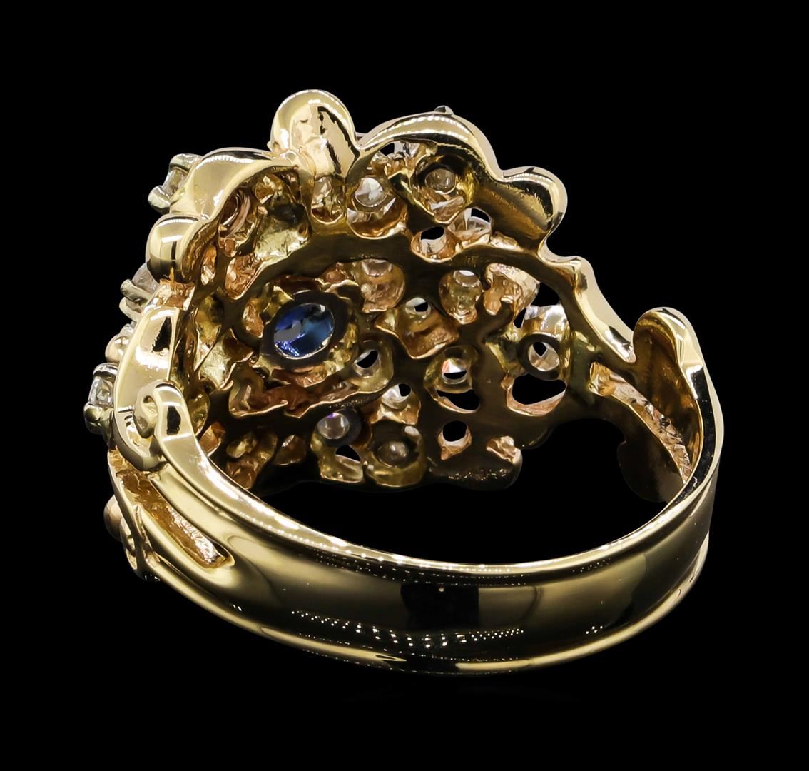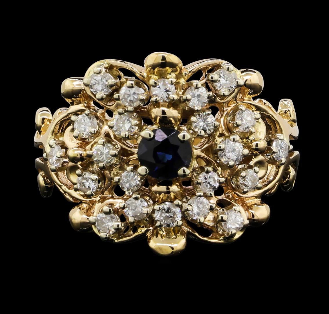 One 14KT Yellow Gold 0.50ct Sapphire and Diamond Ring. (1) Sapphire with a total weight of 0.50cts. Diamonds with a total weight 0.50cts. Total weight of the ring is 6.40 grams.