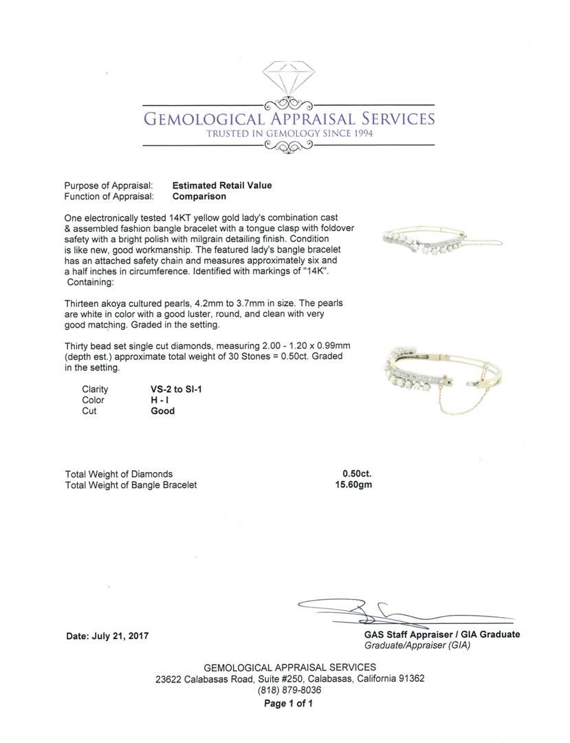 One electronically tested 14KT yellow gold Ladies combination cast & assembled fashion bangle bracelet with a tongue clasp with foldover safety with a bright polish with milgrain detailing finish. The featured Ladies bangle bracelet has an attached safety chain and measures approximately six and a half inches in circumference. Identified with markings of '14K'. Condition is like new, good workmanship. Containing: Thirteen akoya cultured pearls, 4.2mm to 3.7mm in size. The pearls are white in color with a good luster, round, and clean with very good matching. Graded in the setting. Thirty bead set single cut diamonds, measuring 2.00 - 1.20 x 0.99mm (depth est.) approximate total weight of 30 Stones = 0.50ct. Graded in the setting. Color H - I Clarity VS-2 to SI-1 Cut Good. Total Weight of Diamonds 0.50ct. Total Weight of Bangle Bracelet 15.60gm. GAS Appraised.