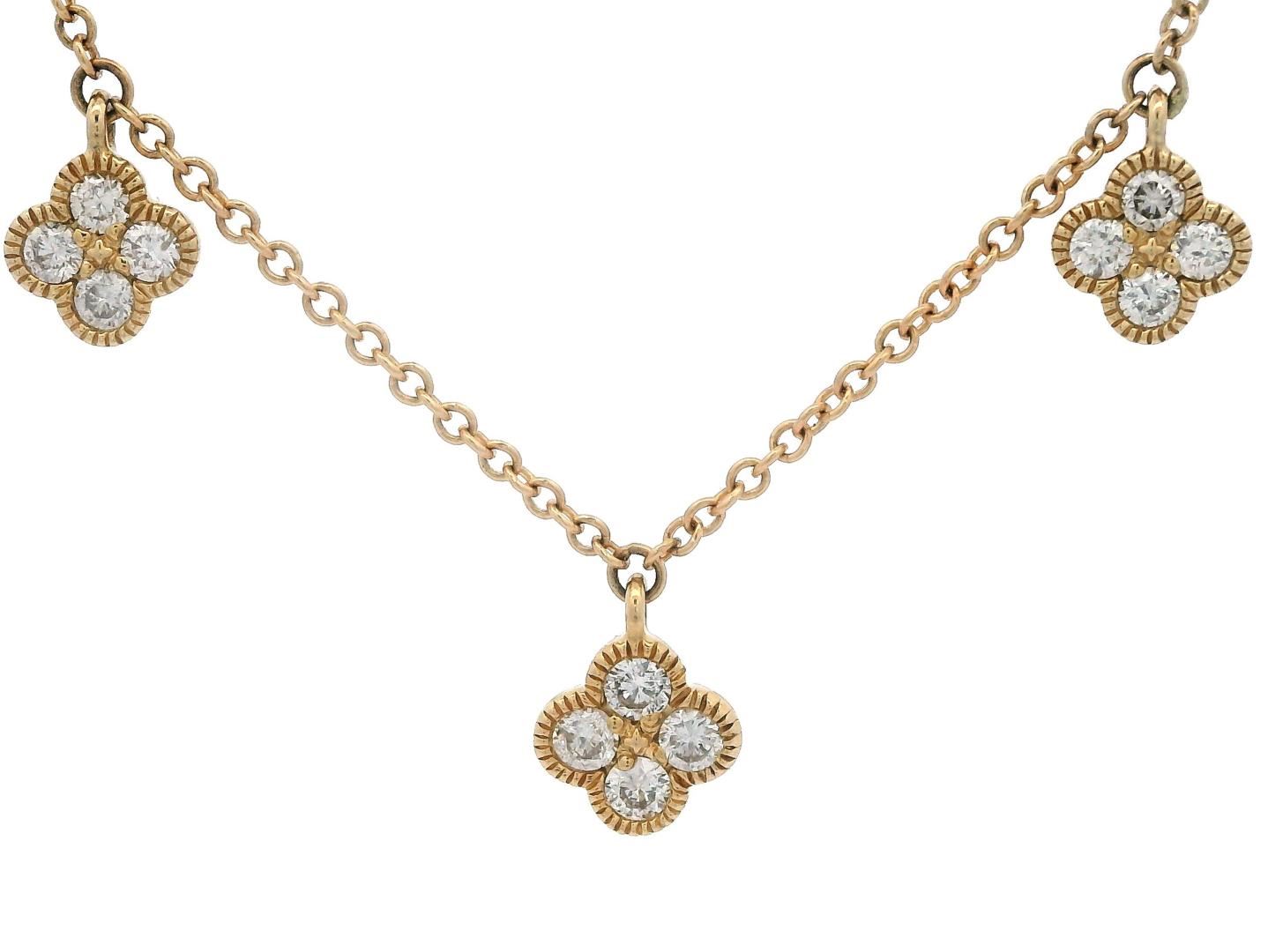 One electronically tested 14KT yellow gold lady's combination cast & assembled fashion station necklace with a lobster claw clasp with a Alhambra motif. Condition is new, good workmanship. The featured lady's necklace measures 17 inches in length, with a adjustment to 16 inches. Identified with markings of "14K". Containing: Twenty channel and prong set round brilliant cut diamonds, measuring 1.90 - 1.90 x 1.18mm (depth est.) approximate total weight of 20 stones= 0.51ct. Graded in the setting. Color: G-I. Clarity: VS-2 to SI-1. Cut: Very Good. Total weight of diamonds: 0.51ct. Total weight of necklace: 2.60gm. Appraised by Gemological Appraisal Services.