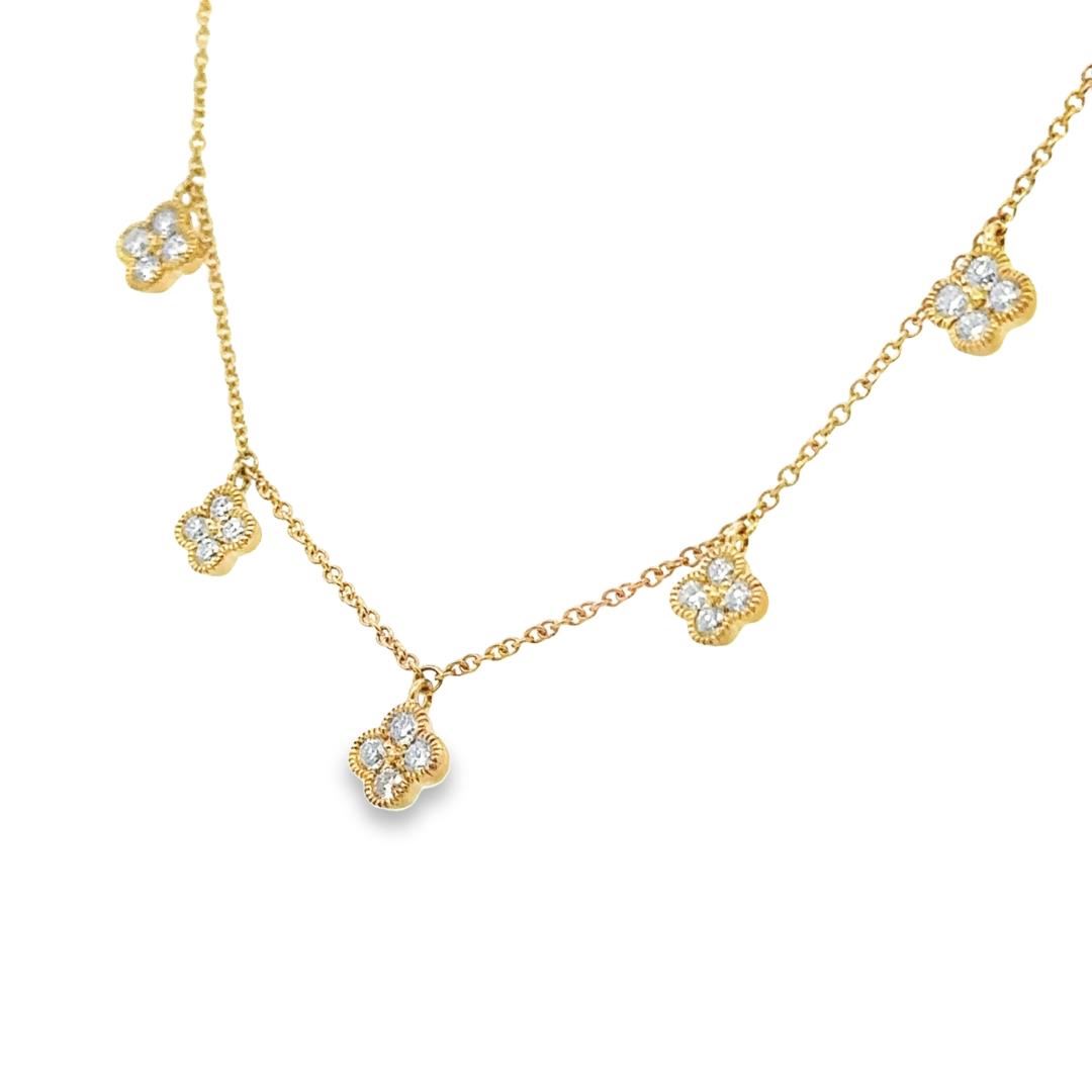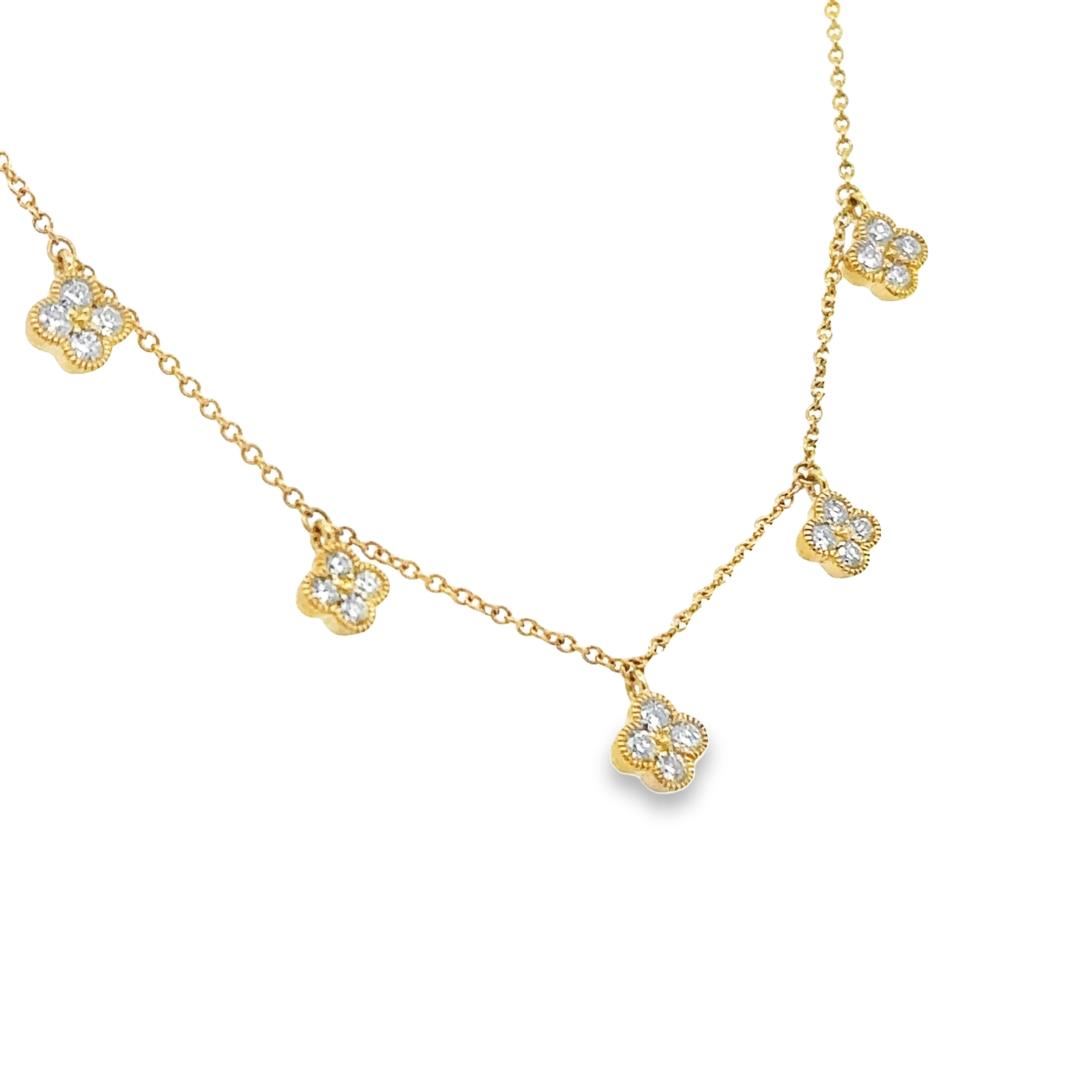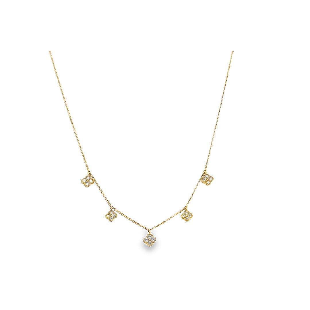 One electronically tested 14KT yellow gold lady's combination cast & assembled fashion station necklace with a lobster claw clasp with a Alhambra motif. Condition is new, good workmanship. The featured lady's necklace measures 17 inches in length, with a GAS Appraised.
