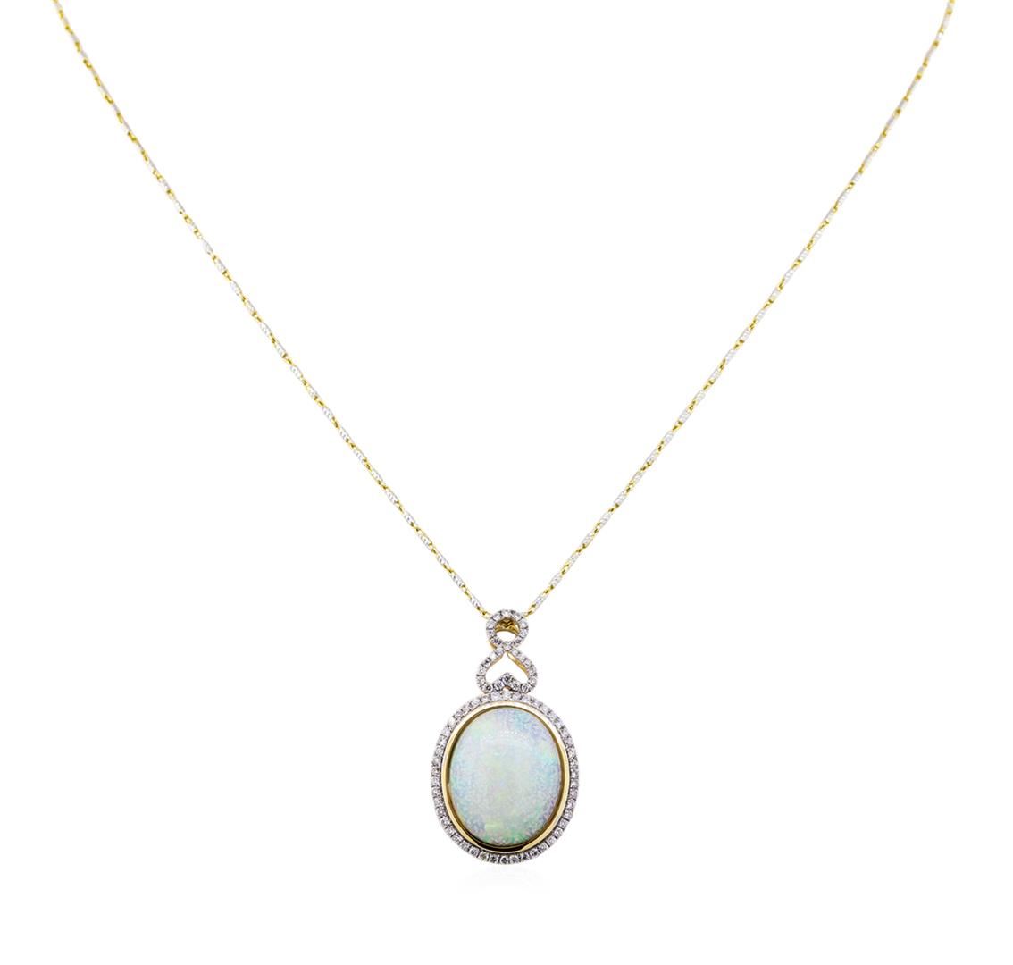 One electronically tested 14KT yellow gold ladies cast & assembled opal and diamond pendant with chain. The pendant features an opal set within a diamond bezel, completed by a diamond set bail. The pendant is supported by an eighteen inch length 14KT yellow gold designer style chain with rhodium accents, terminating in a lobster claw clasp. Bright polish finish with rhodium accents. Trademark is Orianne. Identified with markings of "14K". Condition is new, good workmanship. Containing: One crystal opal that is cut in a oval shaped cabochon and is bezel set, measuring 18.50 mm long x 15.00 mm wide, and 5.20 mm thick and the approximate weight is 9.15 carats. The opal has a bright, multicolor play of color (fire) in a flashfire pattern; a medium dome; a good cut; slightly included; minor dull spot in its brightness and pattern; and is somewhat directional. Indications of sugar treatment. Graded in the setting. Seventy-One prong set round brilliant cut diamonds approximate. Total Weight of 71 Stones = 0.56ct. Graded in the setting. Clarity: SI-2 to I-2. Color: G - I. Total Weight of Diamonds 0.56ct. Total Weight of Opals 9.15ct. Total Weight of Pendant With Chain 10.89gm. AIG Appraised at $4,705.00.