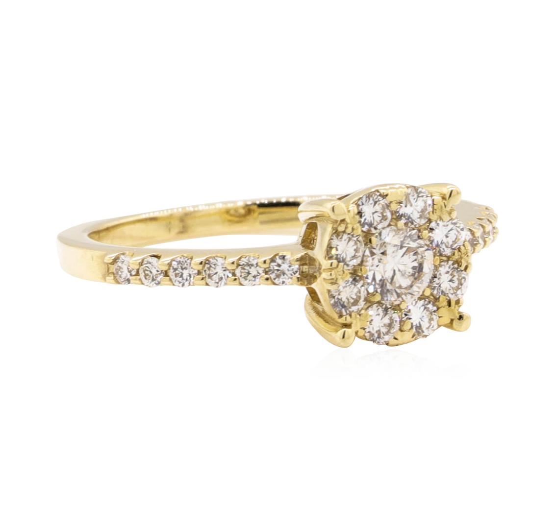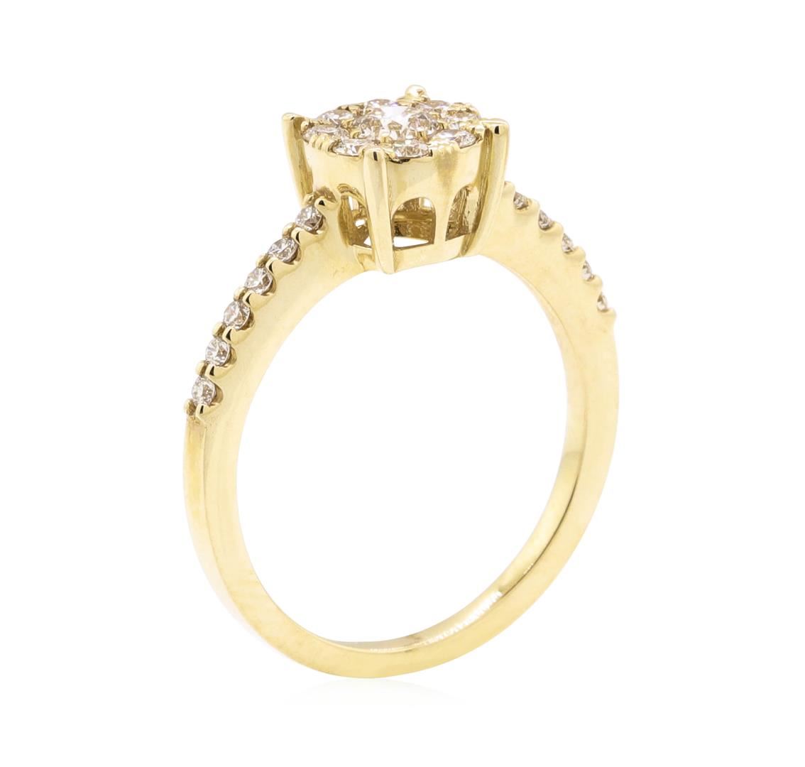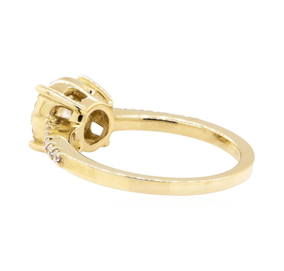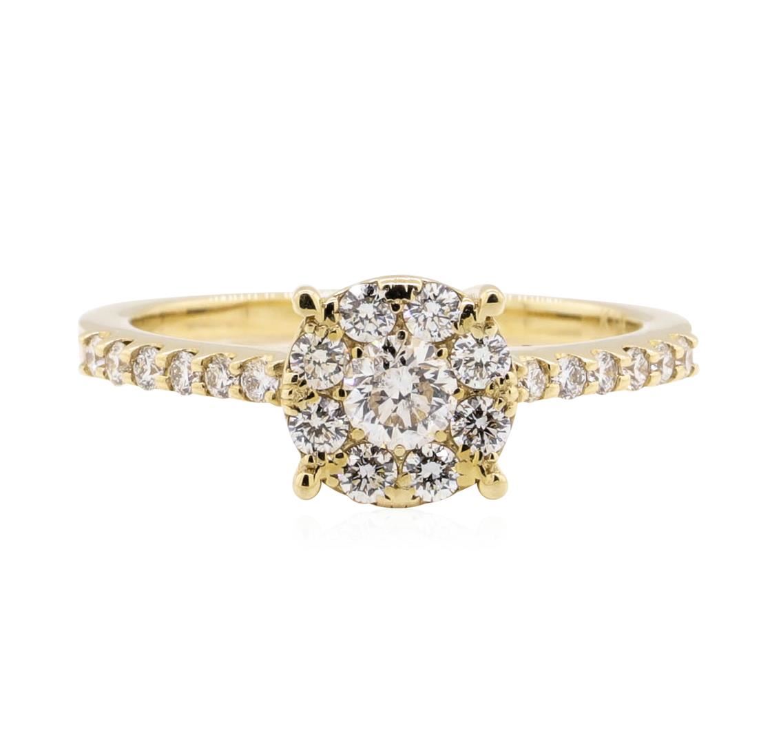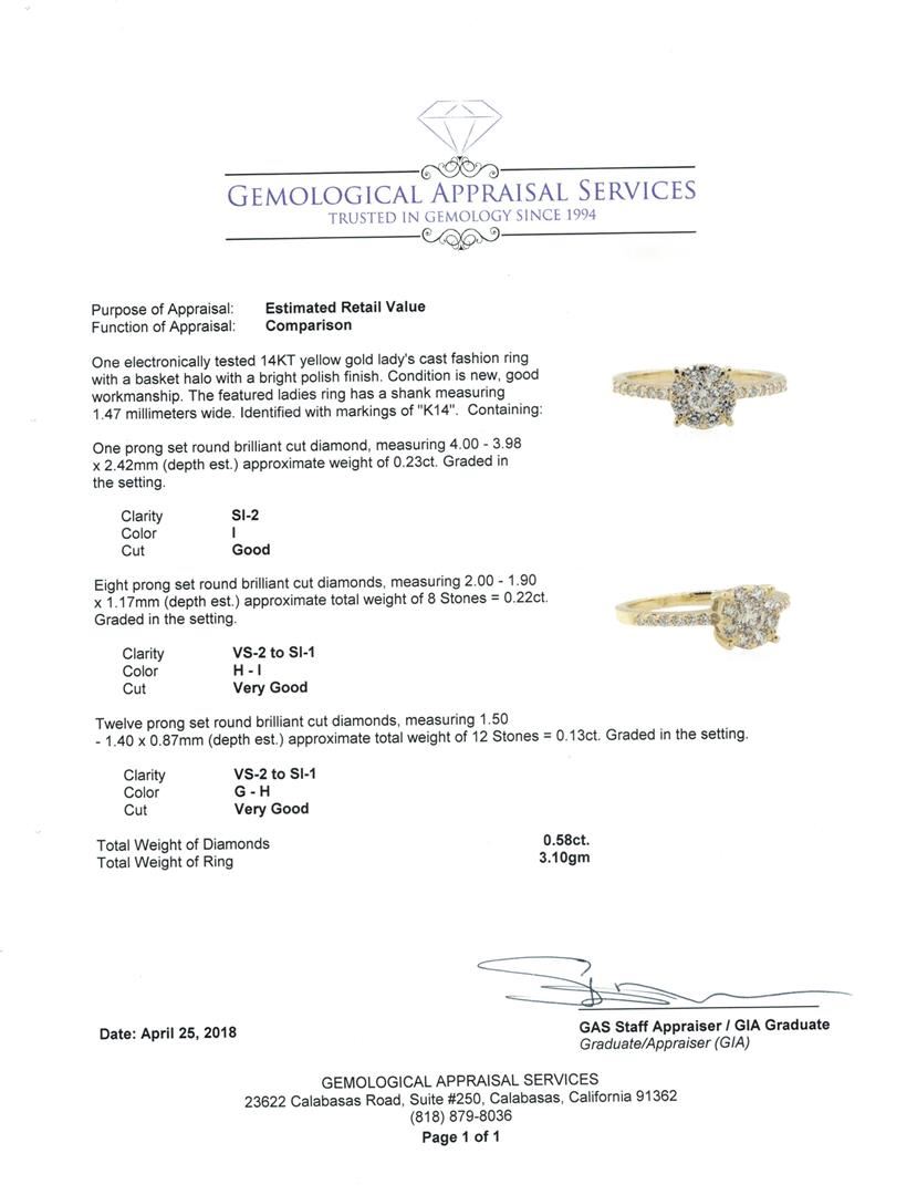 One electronically tested 14KT yellow gold Ladies cast fashion ring with a basket halo with a bright polish finish. The featured ladies ring has a shank measuring 1.47 millimeters wide. Identified with markings of 'K14'. Condition is new, good workmanship. Containing: One prong set round brilliant cut diamond, measuring 4.00 - 3.98 x 2.42mm (depth est.) approximate weight of 0.23ct. Graded in the setting. Color I Clarity SI-2 Cut Good Eight prong set round brilliant cut diamonds, measuring 2.00 - 1.90 x 1.17mm (depth est.) approximate total weight of 8 Stones = 0.22ct. Graded in the setting. Color H - I Clarity VS-2 to SI-1 Cut Very Good Twelve prong set round brilliant cut diamonds, measuring 1.50 - 1.40 x 0.87mm (depth est.) approximate total weight of 12 Stones = 0.13ct. Graded in the setting. Color G - H Clarity VS-2 to SI-1 Cut Very Good. Total Weight of Diamonds 0.58ct.. Total Weight of Ring 3.10gm. GAS Appraised.