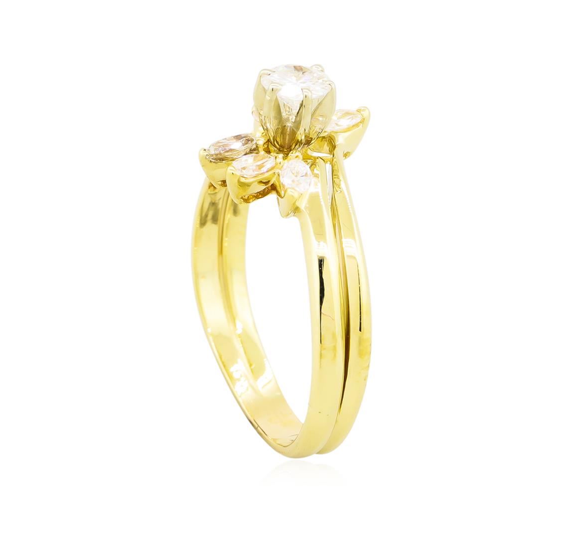 One set electronically tested 14KT yellow gold lady's combination cast & assembled wedding ring soldered to wedding band with a bright polish finish. The featured lady's ring has a double shank measuring 2.93 millimeters wide. Identified with markings of "14K". Condition is used, good workmanship. Containing: One prong set round brilliant cut diamond, measuring 4.31 - 4.26 x 2.66mm (depth est.) approximate weight of 0.30ct. Graded in the setting. Clarity: SI-1. Color: F - G, Cut Good. Six prong set marquise shaped cut diamonds, measuring 3.60 x 1.90 x 1.20mm (depth est.) approximate. Total Weight of 6 Stones = 0.30ct. Graded in the setting. Clarity: SI-1 to SI-2. Color: I - J, Cut Good. Total Weight of Diamonds 0.60ct. Total Weight of Ring Soldered To Wedding Band 3.50gm. GAS Appraised at $2,940.00.