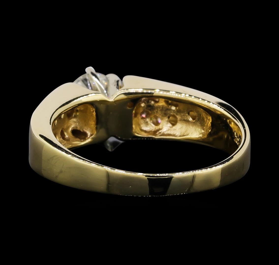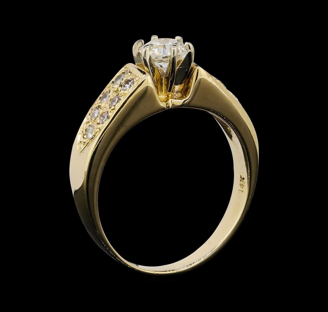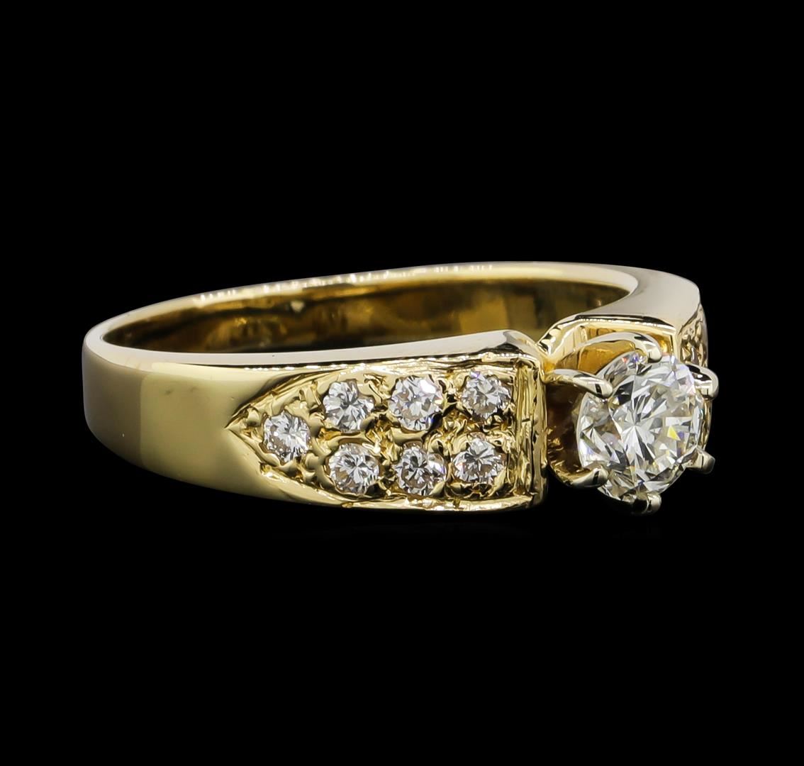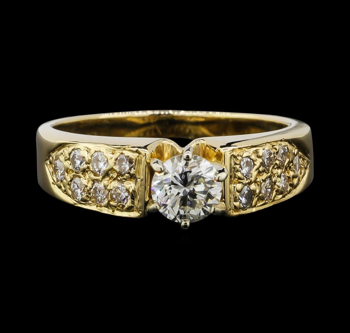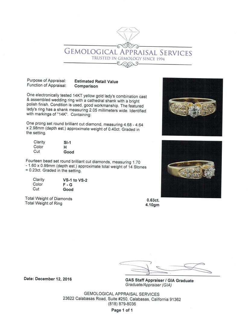 One electronically tested 14KT yellow gold lady's combination cast & assembled wedding ring with a cathedral shank with a bright polish finish. The featured lady's ring has a shank measuring 2.05 millimeters wide. Identified with markings of "14K". Condition is used, good workmanship. Containing: One prong set round brilliant cut diamond, measuring 4.68 - 4.64 x 2.98mm (depth est.) approximate weight of 0.40ct. Graded in the setting. Clarity: SI-1. Color: HCut Good Fourteen bead set round brilliant cut diamonds, measuring 1.70 - 1.60 x 0.99mm (depth est.) approximate total weight of 14 Stones = 0.23ct. Graded in the setting. Clarity: VS-1 to VS-2. Color: F - GCut Good. Total Weight of Diamonds 0.63ct. Total Weight of Ring 4.10gm. GAS Appraised.