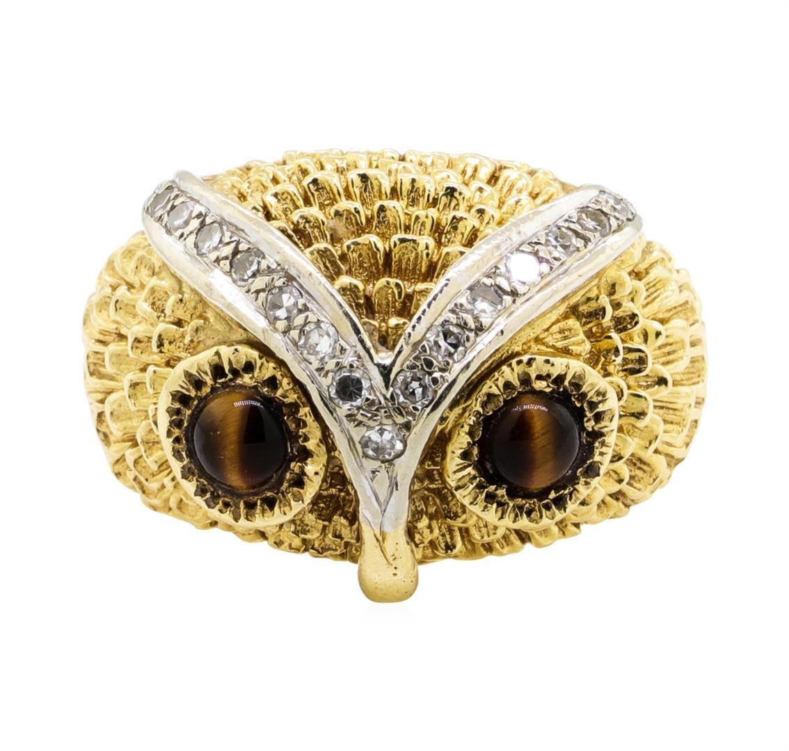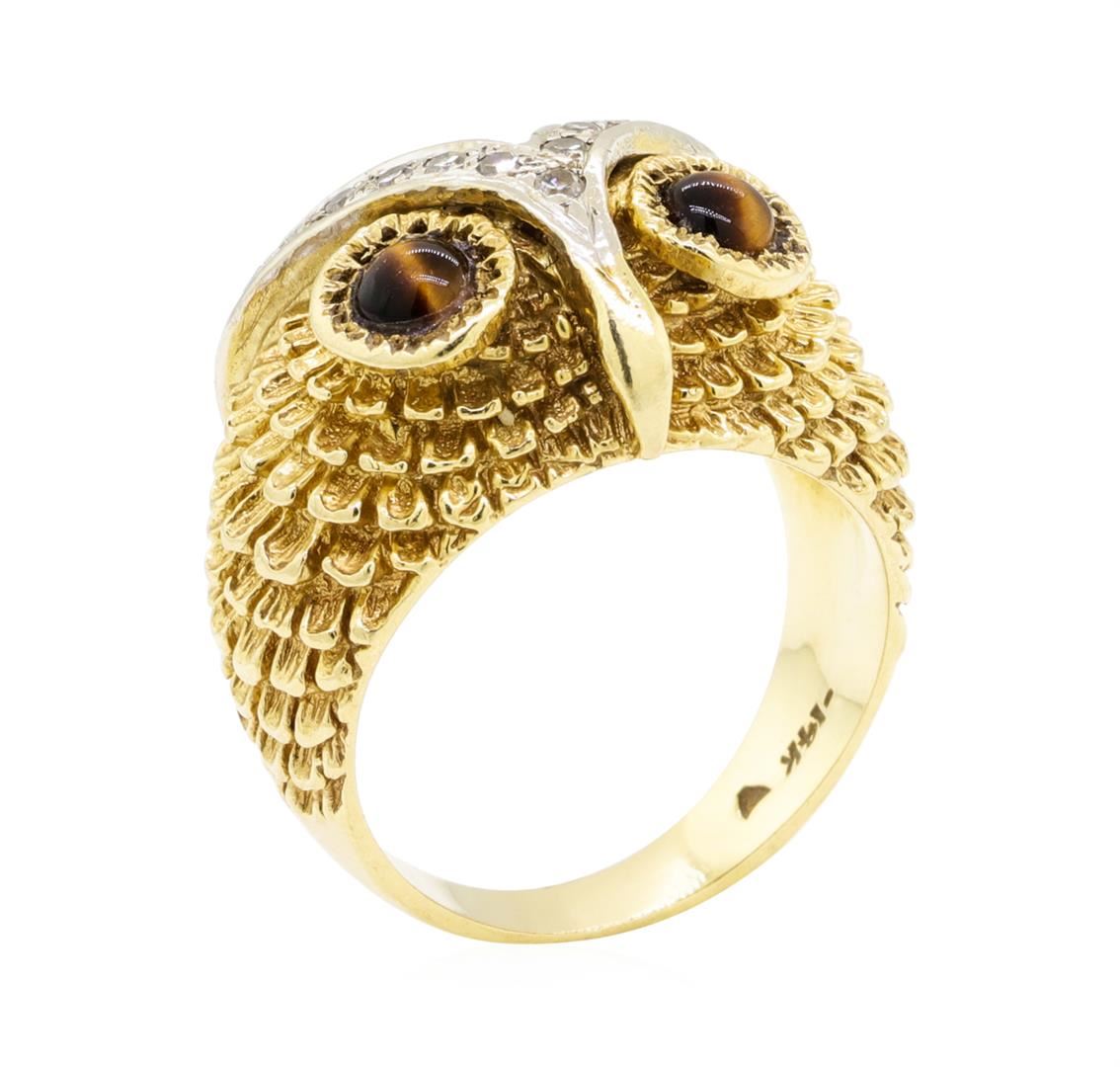 14KT Yellow Gold 0.65 ctw Tiger's Eye and Diamond Owl Motif Ring