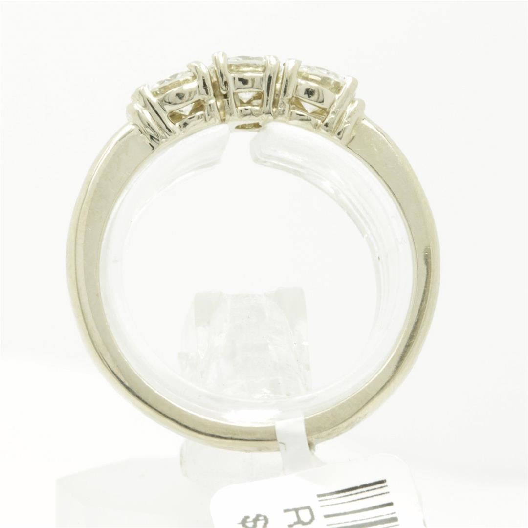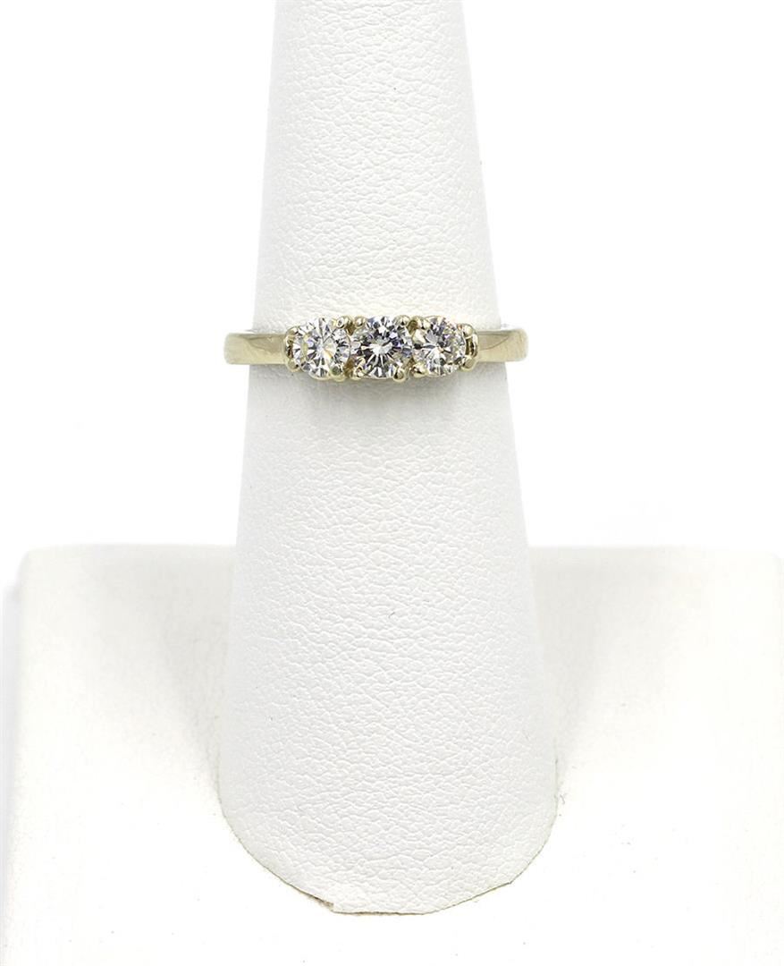 One Round Cut Three-Stone Diamond Engagement Band Ring. The setting style is a three stone design. Made with 14k white gold. Gross weight is 3.12 grams with a total of 3 stones. Size 6 but is resizable. Condition is brand new. Main stone is non-enhanced and natural. Main diamond is 0.66 carats, shape brilliant round cut, clarity SI-1, color H-1, and cut is very good.