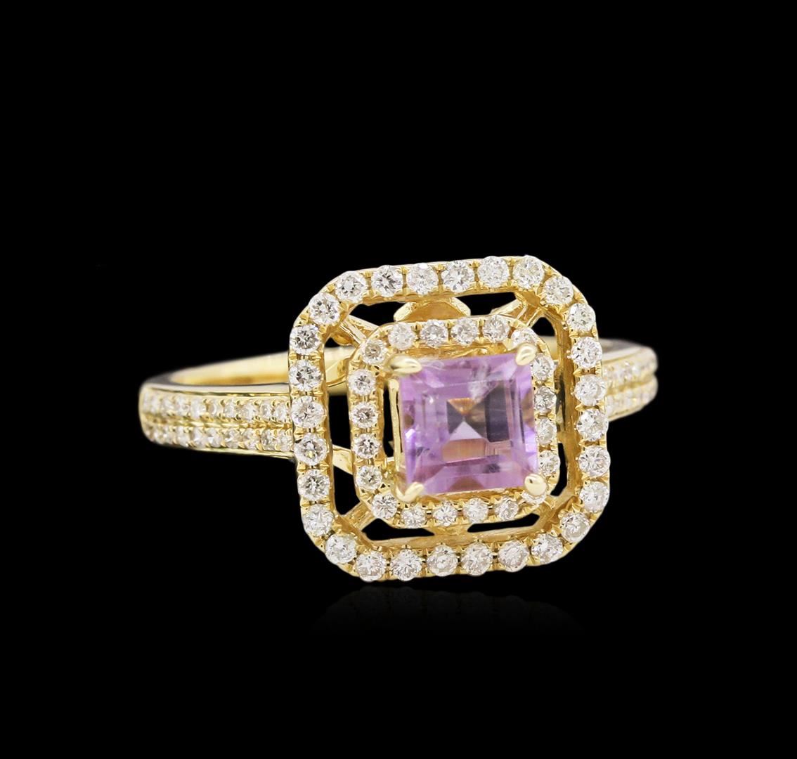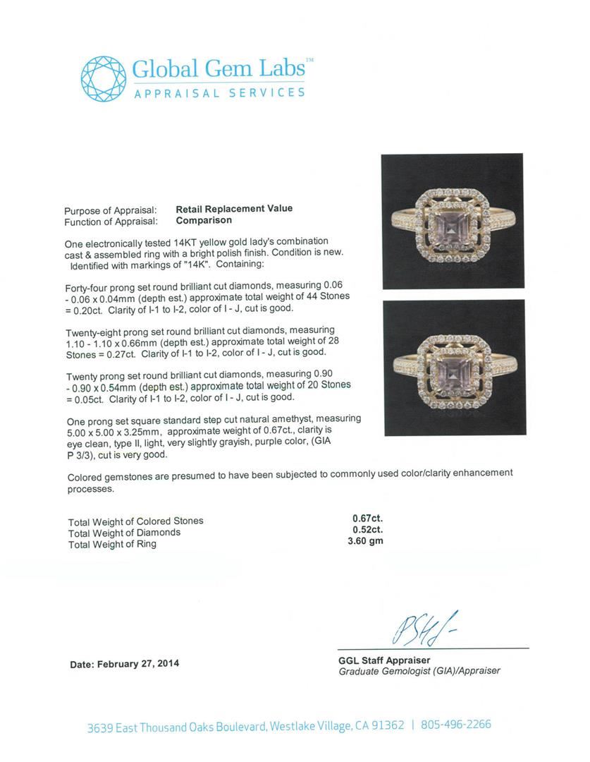 One electronically tested 14KT yellow gold Ladies combination cast & assembled ring with a bright polish finish. Condition is new. Identified with markings of "14K". Containing: Forty-Four prong set round brilliant cut diamonds, measuring 0.06 - 0.06 x 0.04mm (depth est.) approximate. Total Weight of 44 Stones = 0.20ct. Clarity: I-1 to I-2. Color: I - J, Cut is Good. Twenty-Eight prong set round brilliant cut diamonds, measuring 1.10 - 1.10 x 0.66mm (depth est.) approximate. Total Weight of 28 Stones = 0.27ct. Clarity: I-1 to I-2. Color: I - J, Cut is Good. Twenty prong set round brilliant cut diamonds, measuring 0.90 - 0.90 x 0.54mm (depth est.) approximate. Total Weight of 20 Stones = 0.05ct. Clarity: I-1 to I-2. Color: I - J, Cut is Good. One prong set square standard step cut natural amethyst, measuring 5.00 x 5.00 x 3.25mm, approximate weight of 0.67ct., clarity is eye clean, type II, light, very slightly grayish, purple color, (GIA P 3/3), cut is very good. Colored gemstones are presumed to have been subjected to commonly used color/clarity enhancement processes. Total Weight of Colored Stones 0.67ct. Total Weight of Diamonds 0.52ct. Total Weight of Ring 3.60 grams. GGL Appraised.