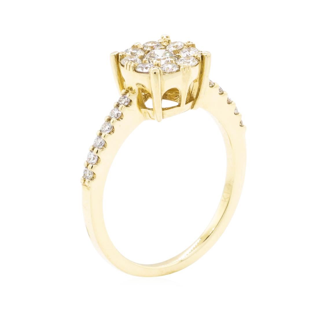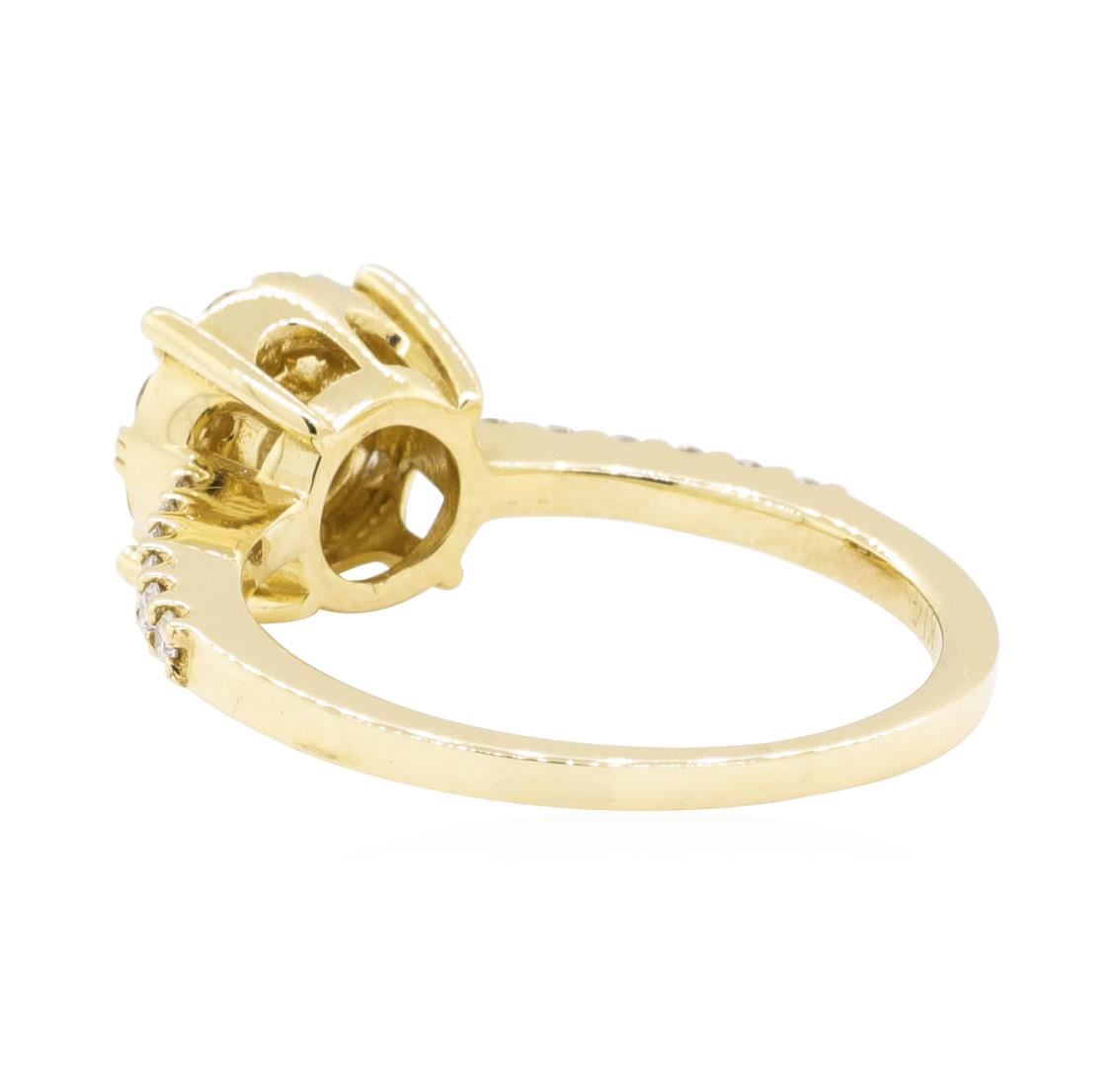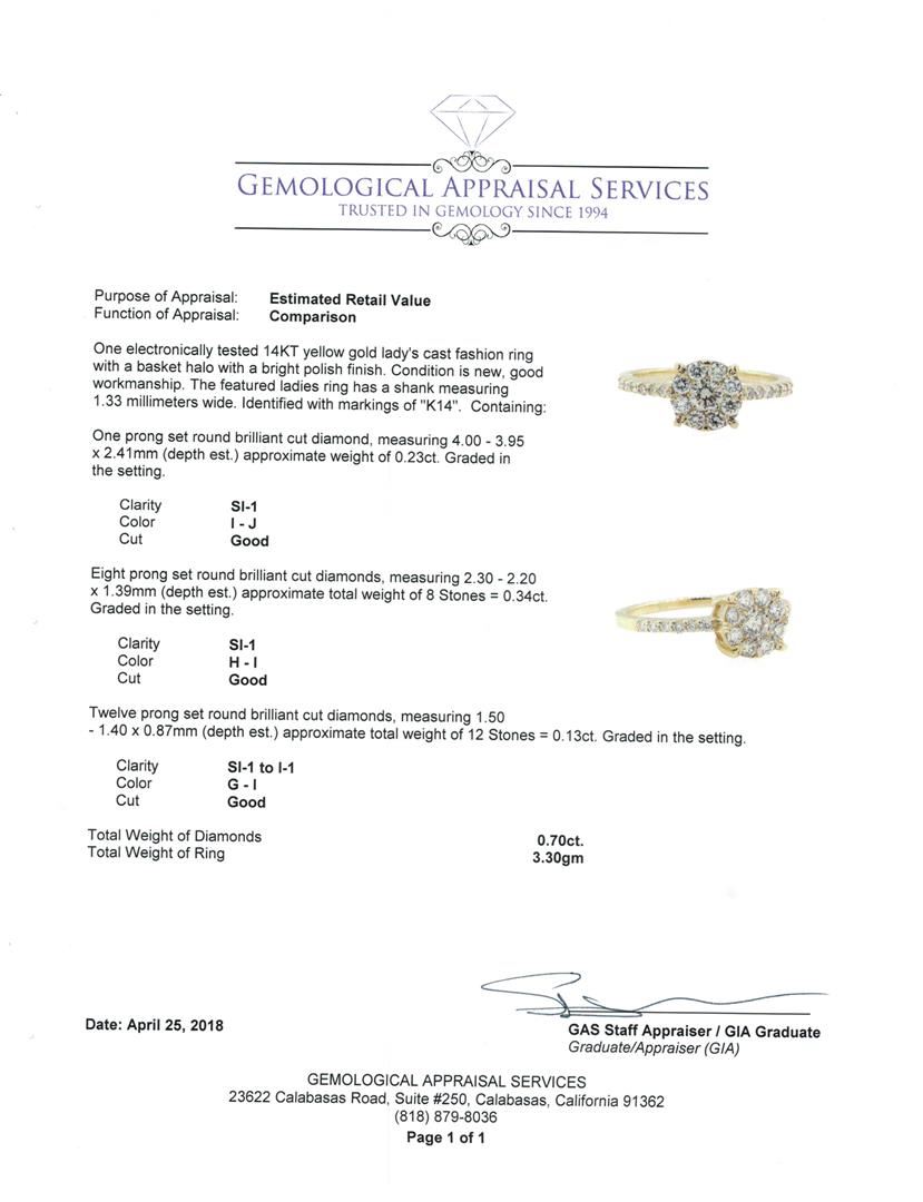 One electronically tested 14KT yellow gold Ladies cast fashion ring with a basket halo with a bright polish finish. The featured ladies ring has a shank measuring 1.33 millimeters wide. Identified with markings of 'K14'. Condition is new, good workmanship. Containing: One prong set round brilliant cut diamond, measuring 4.00 - 3.95 x 2.41mm (depth est.) approximate weight of 0.23ct. Graded in the setting. Color I - J Clarity SI-1 Cut Good Eight prong set round brilliant cut diamonds, measuring 2.30 - 2.20 x 1.39mm (depth est.) approximate total weight of 8 Stones = 0.34ct. Graded in the setting. Color H - I Clarity SI-1 Cut Good Twelve prong set round brilliant cut diamonds, measuring 1.50 - 1.40 x 0.87mm (depth est.) approximate total weight of 12 Stones = 0.13ct. Graded in the setting. Color G - I Clarity SI-1 to I-1 Cut Good. Total Weight of Diamonds 0.70ct.. Total Weight of Ring 3.30gm. GAS Appraised.