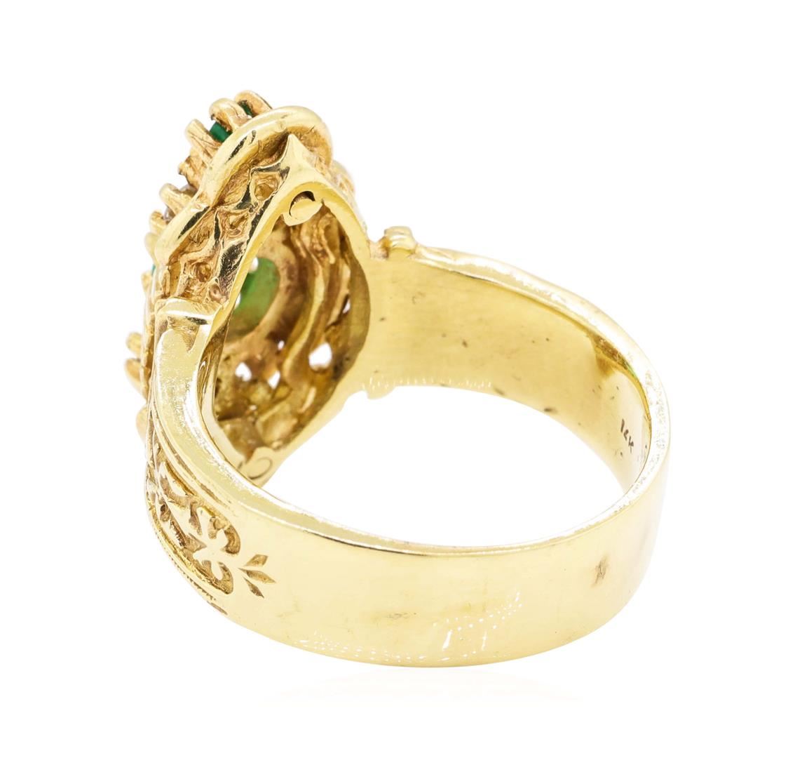 One ladies ring featuring: 14KT yellow gold weighing 10.0 grams containing emeralds weighing 0.50ctw and diamonds weighing 0.20ctw. The ring is a size 8.5.