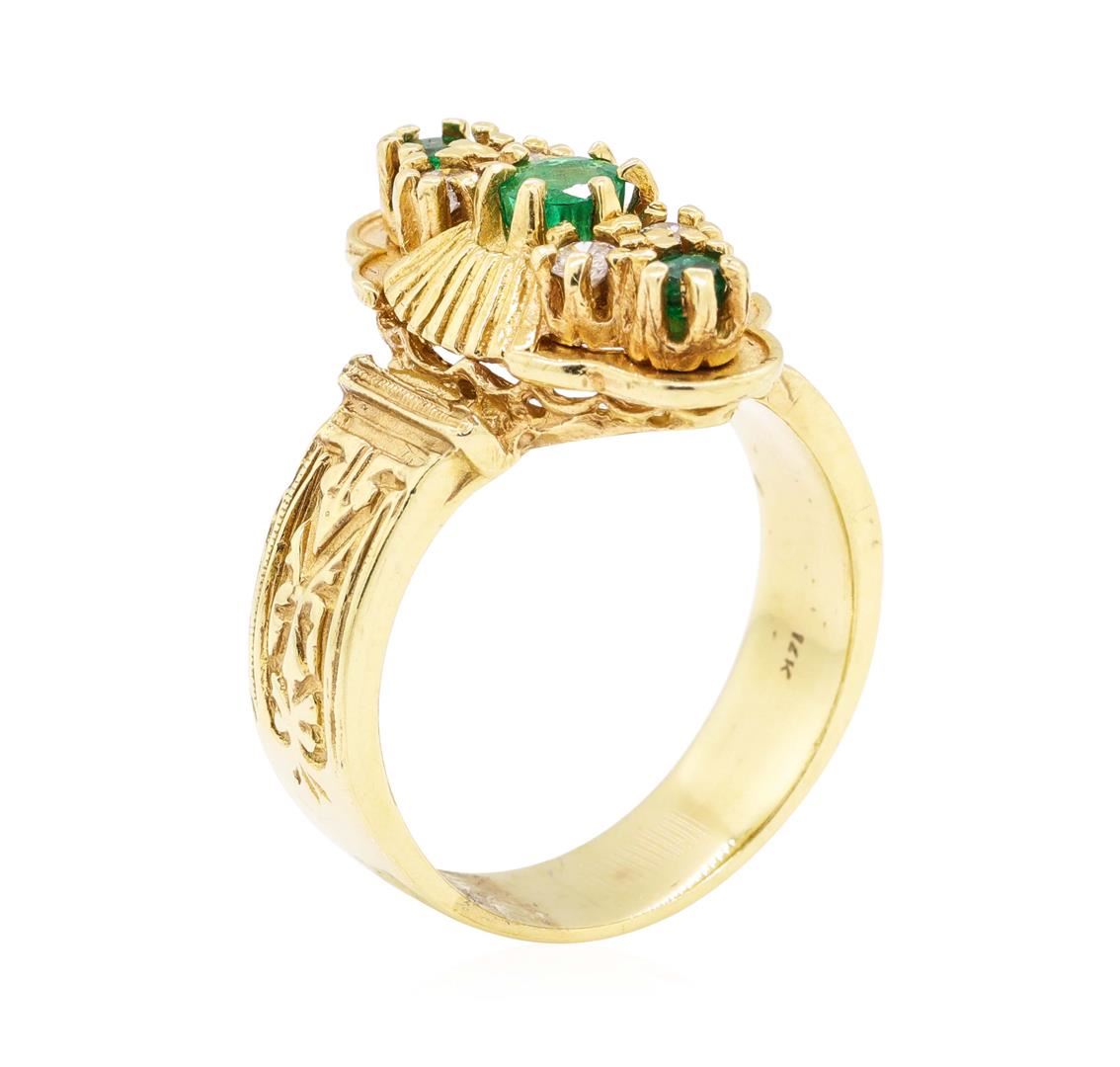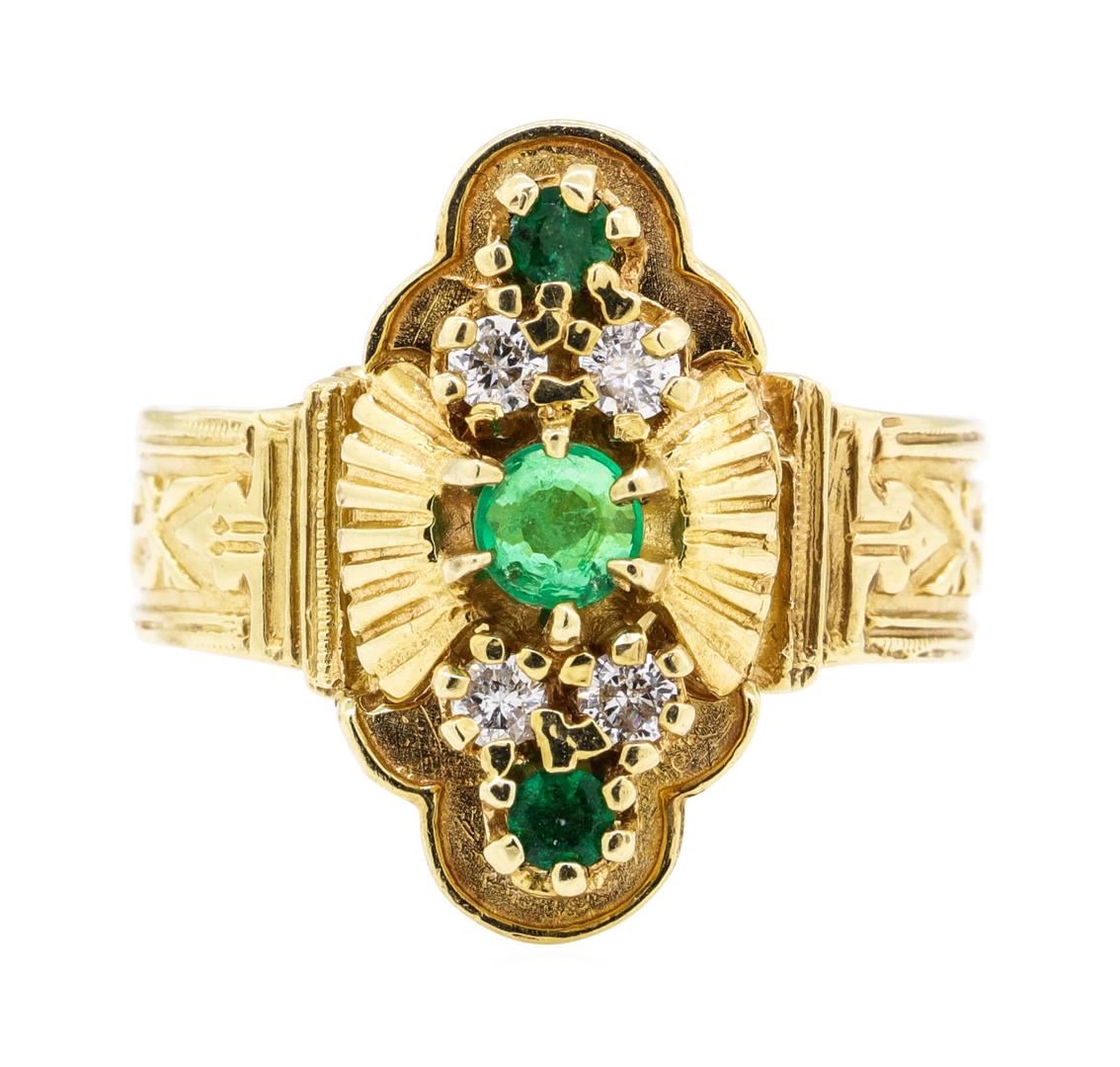 One ladies ring featuring: 14KT yellow gold weighing 10.0 grams containing emeralds weighing 0.50ctw and diamonds weighing 0.20ctw. The ring is a size 8.5.