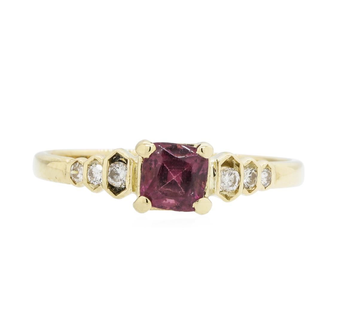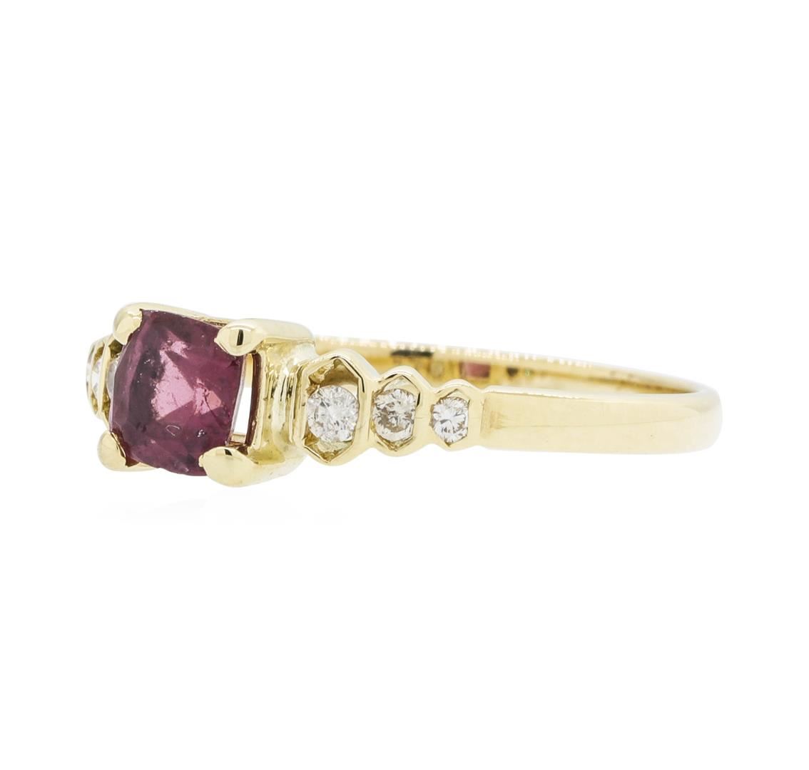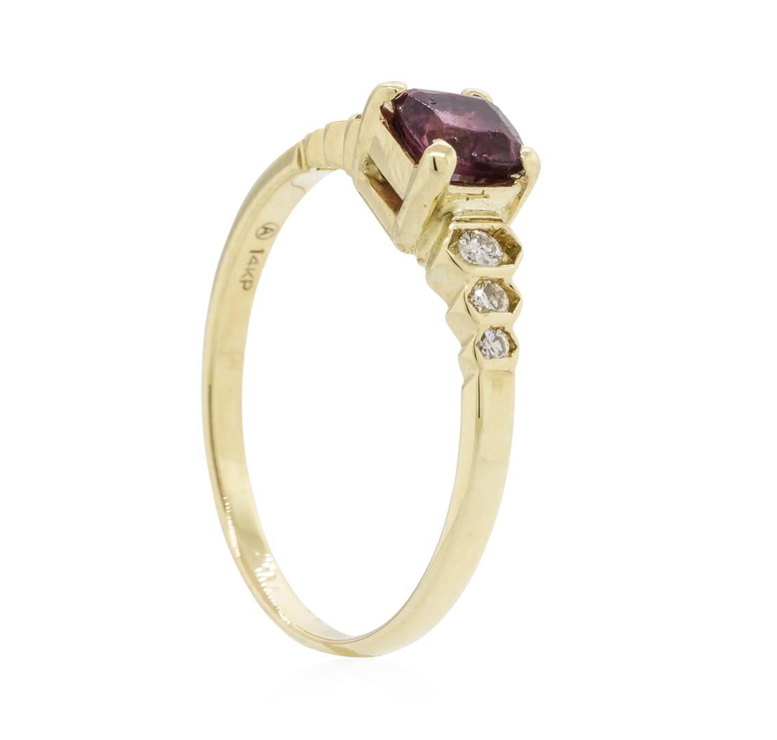 One lady's ring featuring: 14KT yellow gold weighing 2.0 grams containing one pink tourmaline weighing 0.70ct and diamonds weighing 0.15ctw. The ring is a size 7.25.