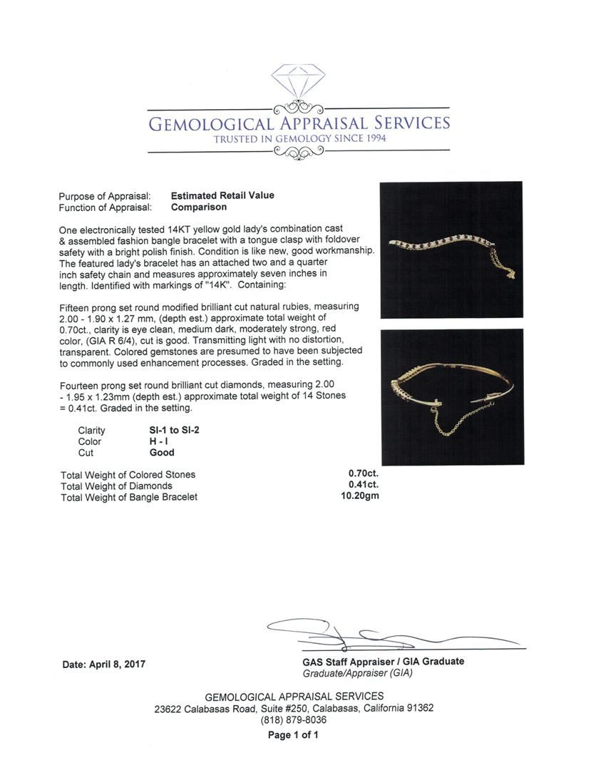 One electronically tested 14KT yellow gold lady's combination cast & assembled fashion bangle bracelet with a tongue clasp with foldover safety with a bright polish finish. The featured lady's bracelet has an attached two and a quarter inch safety chain and measures approximately seven inches in length. Identified with markings of "14K". Condition is like new, good workmanship. Containing: Fifteen prong set round modified brilliant cut natural rubies, measuring 2.00 - 1.90 x 1.27 mm, (depth est.) approximate total weight of 0.70ct., clarity is eye clean, medium dark, moderately strong, red color, (GIA R 6/4), cut is good. Transmitting light with no distortion, transparent. Colored gemstones are presumed to have been subjected to commonly used enhancement processes. Graded in the setting. Fourteen prong set round brilliant cut diamonds, measuring 2.00 - 1.95 x 1.23mm (depth est.) approximate total weight of 14 Stones = 0.41ct. Graded in the setting. Color H - I Clarity SI-1 to SI-2 Cut Good. Total Weight of Colored Stones 0.70ct. Total Weight of Diamonds 0.41ct. Total Weight of Bangle Bracelet 10.20gm. GAS Appraised.